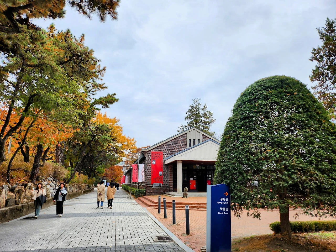 전망 좋은 곳에서 단체로 기념사진도 찍고 산에서 내려가는 발길을 재촉한다. 박물관에서 학예사가 우리를 기다리고 있기 때문이다. 정상에서부터 시립대로 가는 길은 이정표가 정확하지 않아 여러 번 물어가며 내려간다. 다행히 배봉산 둘레길과 연결된 시립대 캠퍼스의 음악관 근처에 쉽게 이른다. 서울에 오래 살았으면서도 서울시립대에는 처음 와 보았는데 넓은 부지에 건물도 많고 규모가 아주 큰 대학이다. 이 대학의 명소인듯한 운치 있는 하늘못을 지나 정문으로 향하는 큰길에는 줄지어 선 은행나무가 때마침 황금빛으로 물들어 환하게 빛나고 있다. 그 아래로 걸어가는 학생들의 걸음이 매우 활기차 보인다. 정문 쪽으로 가다가 왼편으로 내려가니 박물관답게 고풍스러운 건물이 한채 나타난다. 전시관이다.