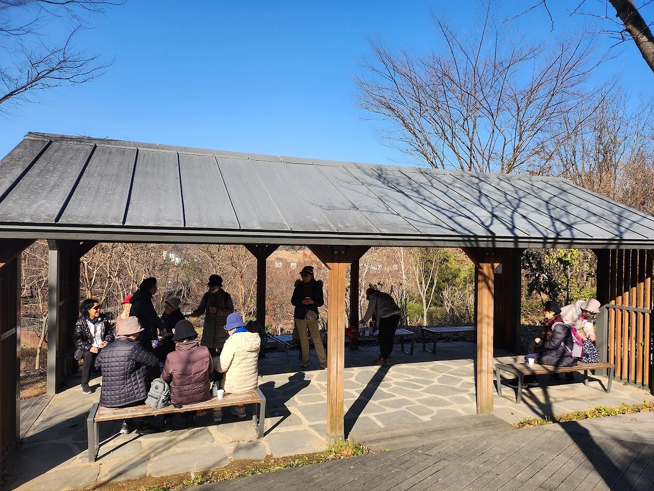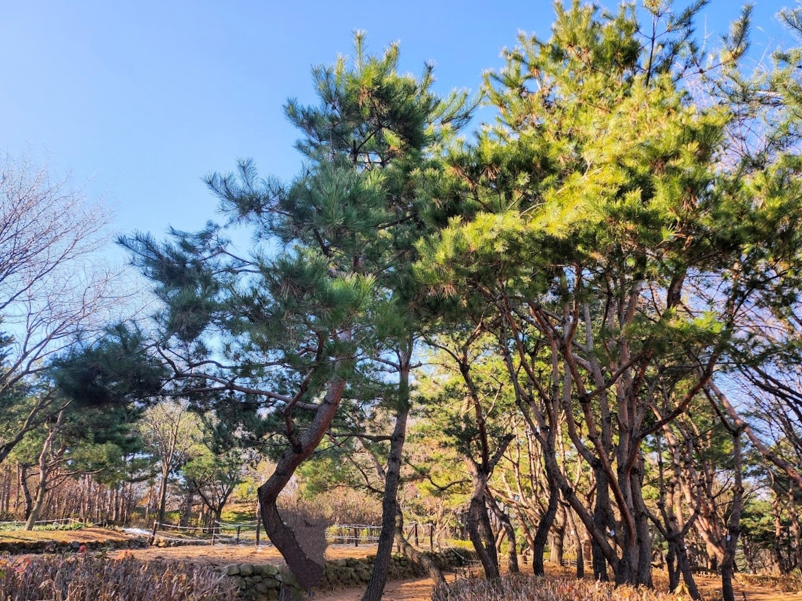 불국사에서 내려오면서 보이는 쉼터에서 잠시 쉬었다가 야생화 화원이라는 곳으로 내려간다. 이곳부터 대모산 도시자연공원이 시작되는 것 같은데 불국사 아래 대모산 북쪽 경사면으로 전에 이곳이 근처 주민들이 무분별하게 텃밭을 가꾸던 곳으로 대모산이 많이 훼손되므로 강남구청이 매입하여 시민공원으로 조성하였다고 한다. 팻말에는 대모산 숲 속 야생화원 안내도도 그려져 있다. 때가 때인 만큼 오늘 야생화 화원은 황량하고 활엽수들도 단풍이 거의 떨어져서 앙상한 가지들만 보이지만 늘 푸른 소나무 숲길도 있어 겨울 소나무의 가치를 드러내고 있다. 한 달 전 단풍철에 왔거나 봄철에 꽃필 때 오면 참 아름다울 것 같다. 내년에 다시 오고 싶은 곳이라고 점찍어 두고 일원역 쪽으로 내려간다.