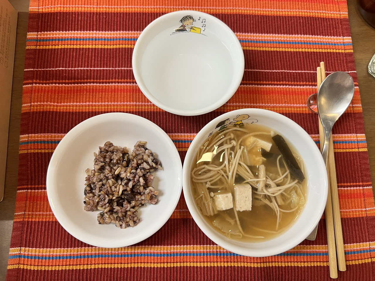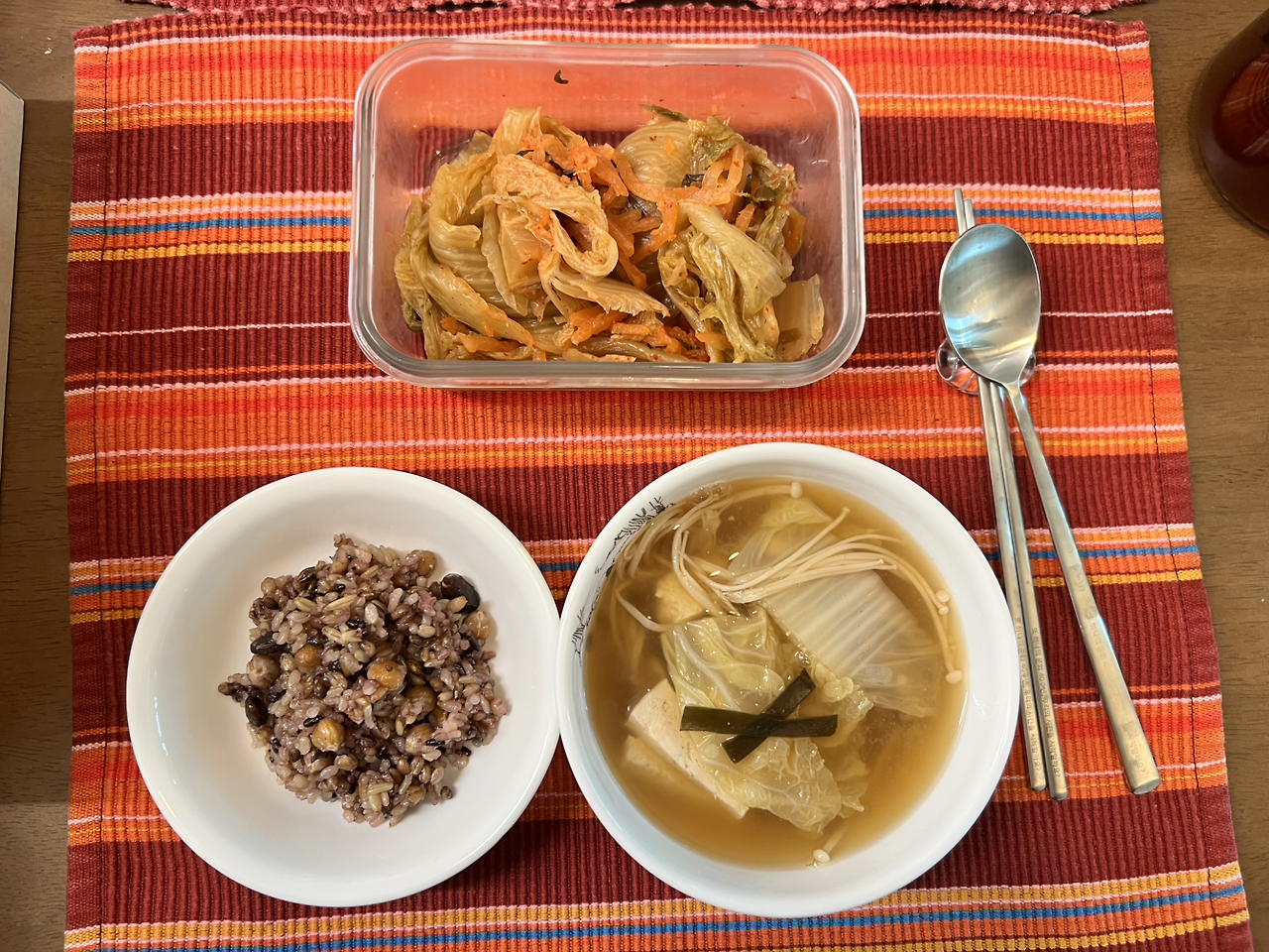 잡곡밥 2/5 공기와 배추 버섯 된장국, 씻은 김치.