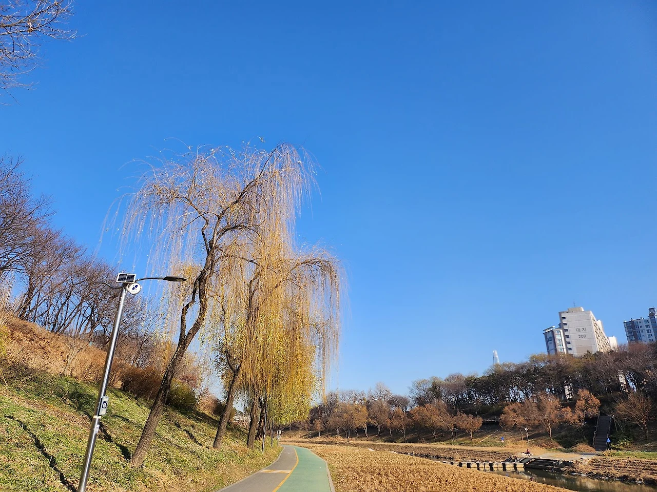 오늘은 벚꽃도 푸른 녹음도 가을단풍도 볼 수 없고 가지만 앙상한 나무들만 서 있고 하천변 부지의 갈대밭도 다 베어지고 황량하지만 쨍하게 파란 겨울하늘이 쓸쓸한 하천 풍경을 보완해 준다. 양재천길을 따라 걷다가 영동대교와 대치교 아래를 지나서 양재천과 탄천이 합류하는 지점 직전에서 잠깐 쉬어 간다. 이곳을 반환점으로 오던 곳으로 되돌아간다. 그러나 돌아가는 길은 하천변 길이 아니라 둑길로 올라가서 걷는다. 옆으로 양재천로 자동차길이 나란히 가므로 차소리가 들리기는 하지만 이 길은 역시 걷기 좋은 산책길이다. 점심시간을 이용해 산책 나온 듯한 젊은 직장인들도 많이 보인다.