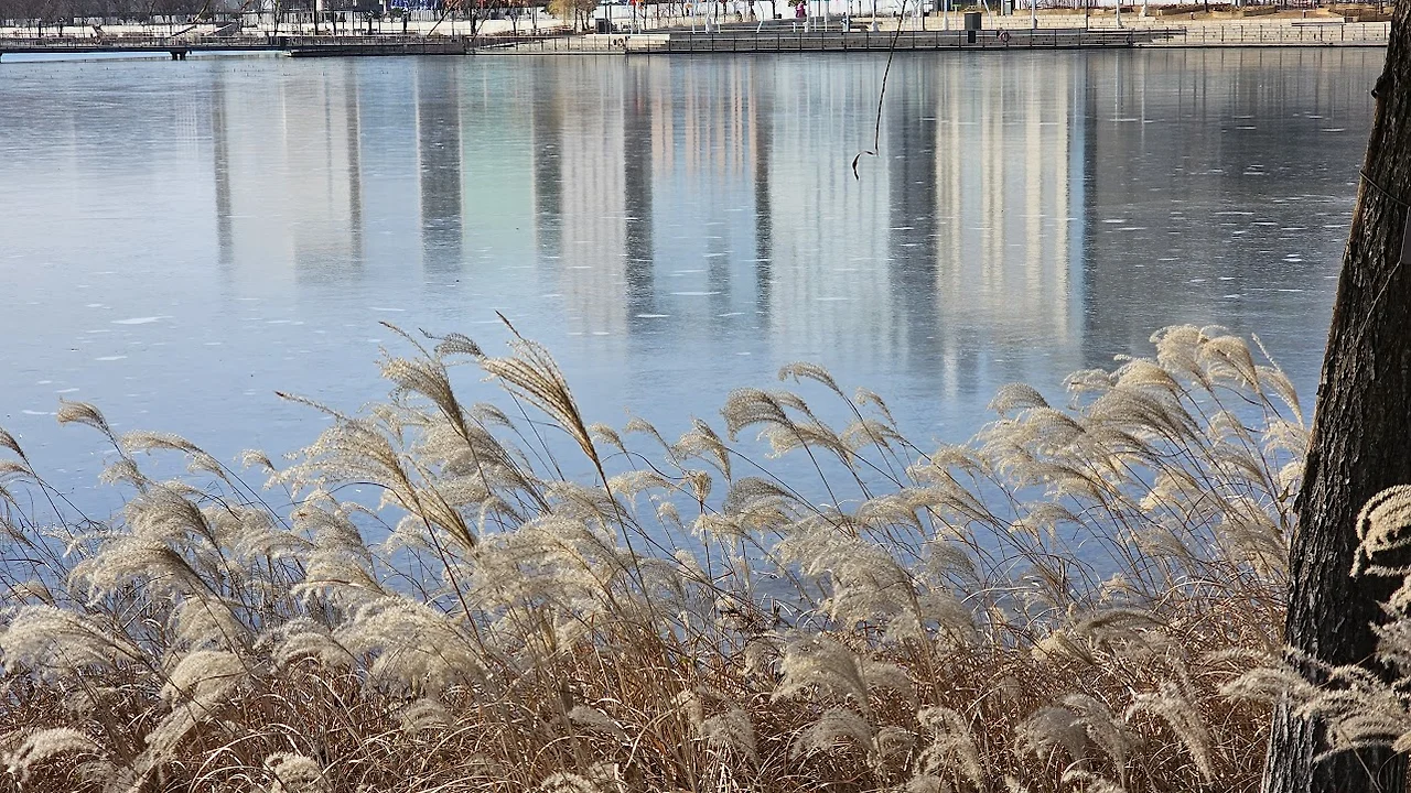 옆으로 이어지는 호수원 주변 풍경도 마찬가지다. 가지가 앙상한 나무들 아래 드문드문 억새꽃만 하얗게 바람에 나부낀다. 무채색 풍경화다.