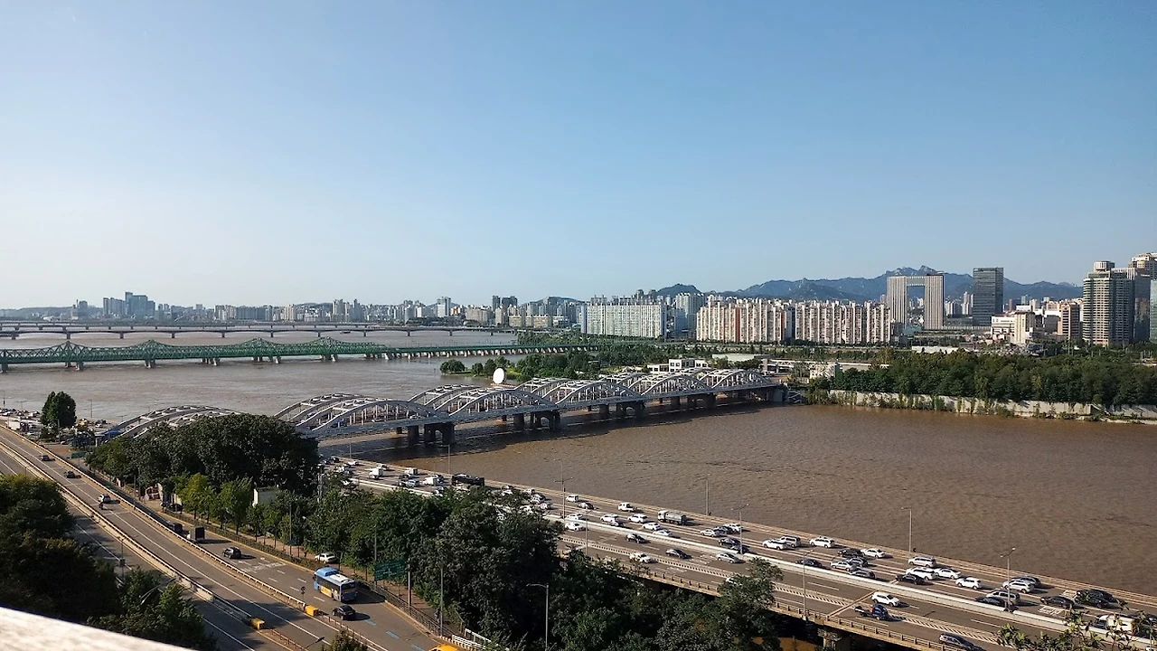 정자 앞에서 내려다본 한강 풍경? 정조임금의 표현 "북쪽의 우뚝한 산과 흘러드는 한강의 모습이 마치 용이 꿈틀거리고 봉황이 나는 것 같다…"는 풍경은 머릿속으로만 상상해야 했다. 흘러드는 강물은 올림픽대로와 한강대교, 노량대교가 뒤얽혀있어 잘 보이지 않고 북쪽의 우뚝한 산은 강 건너 고층 아파트 숲에 가려 산봉우리만 겨우 보일 정도였다. 기대했던 정자에서 보이는 한강 전망에 약간 실망했지만 그래도 이 정자가 이 자리에 아직 남아있어서 이제까지 모르고 있었던 우리 과거의 흔적을 조금이라도 알게 해 준다는 사실이 약간 위안이 되었다.