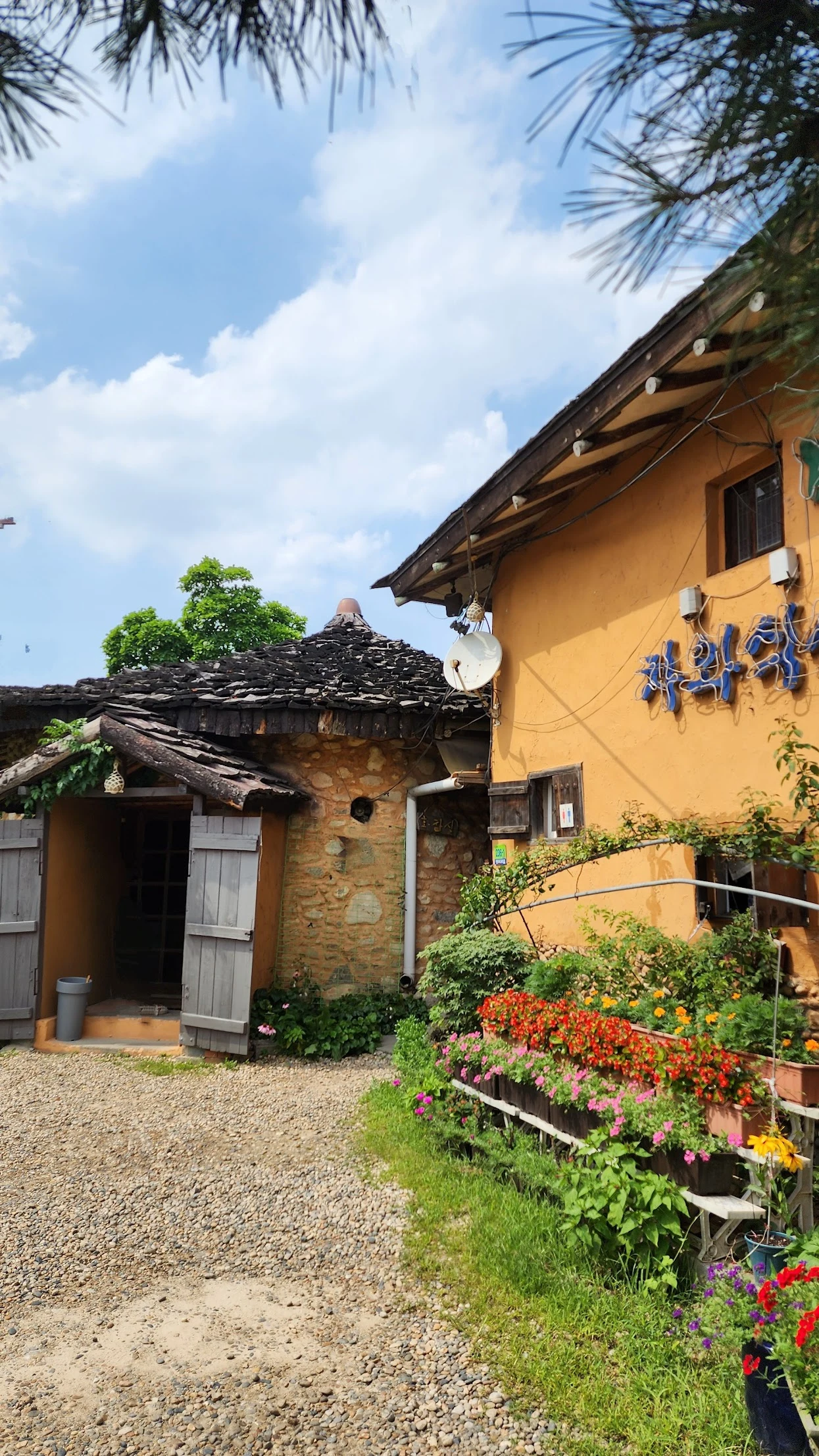 허브공원에서 내려가면 가까운 곳에 인터넷 맛집 소개에서 찾은 맛집이 나온다. 황토벽에 너와지붕을 얹은 건물의 한식당인데 분위기도 좋고 푸짐한 음식도 맛있다고 모두들 만족해한다.