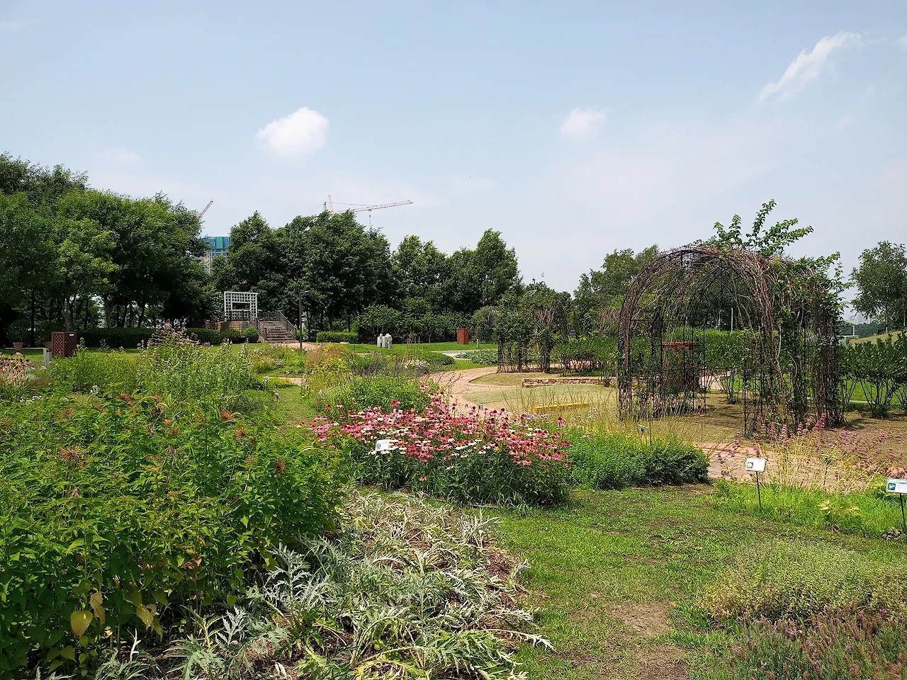 허브천문공원에 오르면 시야가 확 트이며 야생화밭이 넓게 펼쳐져 있다. 그 한쪽에는 밤하늘을 관찰하는 관천대와 작은 온실과 조각품들도 있다. 예상한 대로 허브공원에 대부분의 야생화는 이미 시들었고 얼마 남지 않은 꽃들도 무더위에 힘을 잃었다. 만개한 야생화를 보려면 내년에는 좀 더 일찍 와야겠다. 야생화밭을 돌아서 자작나무들이 무리 지어 모여있는 전망데크로 가니 그곳에는 벤치가 있다. 우리가 자작나무 아래 전망 좋은 벤치에 앉아서 쉬고 있는데 때를 맞춘 듯 시원한 바람이 불어주어 나뭇잎이 살랑거리니 그 자리를 쉽게 떠날 수 없다.