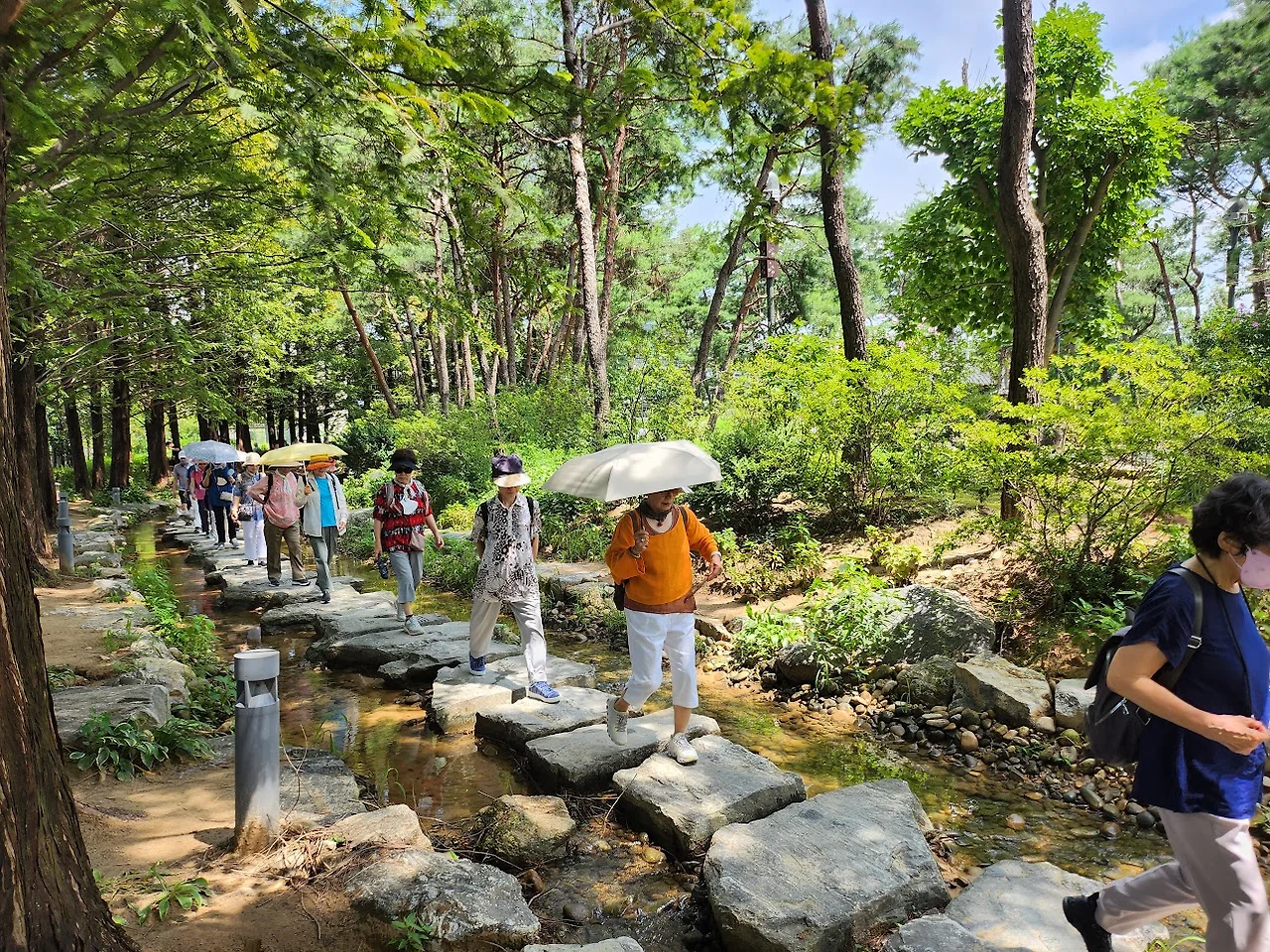 개울옆으로 그늘진 큰 나무 길도 있지만 개울물 소리가 시원한 징검다리 길을 택한다.