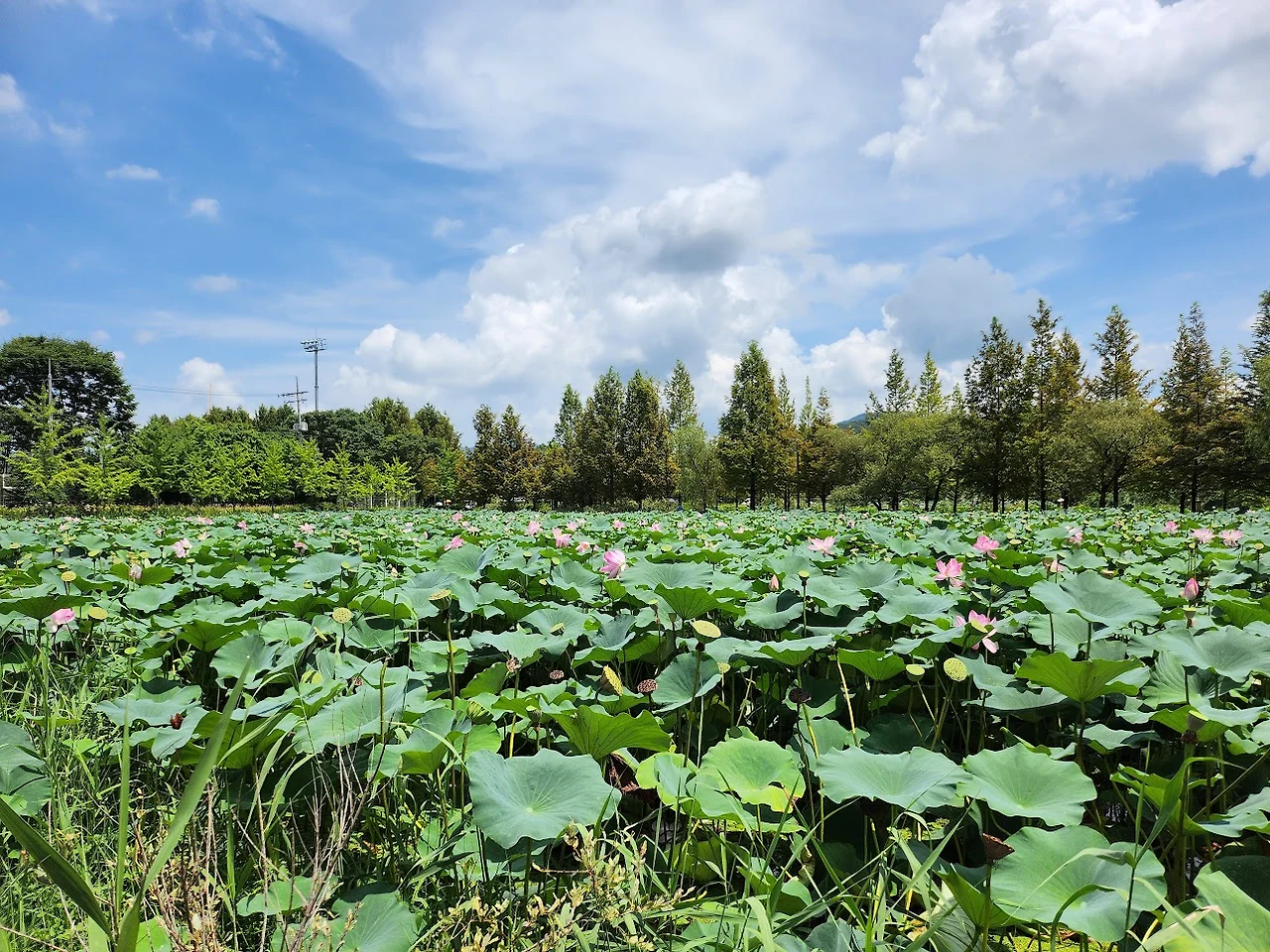 마침 앉아서 쉴 수 있는 평상도 놓여있어 물 한잔 마시고 쉬어 가기로 한다. 다리 아래 평상에 앉으니 바람도 좋고 산과 강과 연꽃밭이 어우러진 아름다운 풍경이 눈에 들어온다. 게다가 오늘은 오래간만에 날씨가 맑아서 파랗게 개인 하늘에 하얗게 뜬 뭉게구름이 예뻐서 보는 이의 탄성을 자아내게 한다.