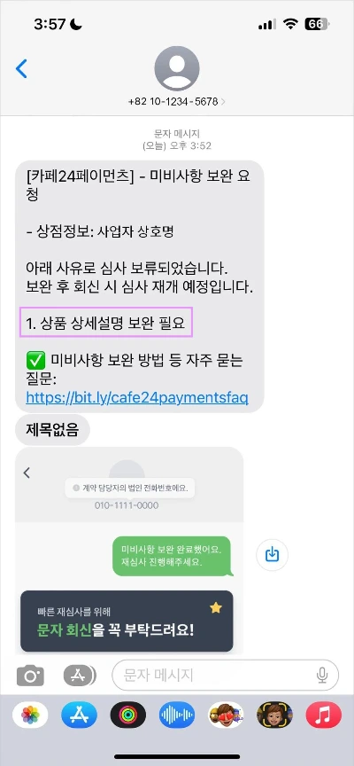 PG사를 이용해 신청한 경우, 가끔은 반려되는 경우가 있을 수 있다. 직접 경험한 반려 사례 중 하나는 등록한 상품의 상세 설명이 미흡하여 구매 가능한 상품으로 인식하기에는 적절하지 않다는 내용이다. 그래서 상품 상세 설명을 구매 유도하는 내용으로 업데이트하고, 다시 신청을 진행했다.