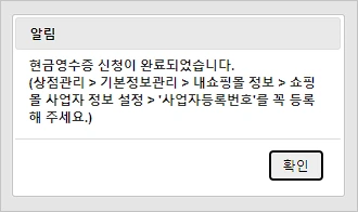 신청하지 않은 상태에서는 카페24 관리자 페이지 [쇼핑몰 설정 > 기본 설정 > 현금 영수증 발행] 메뉴에 접근할 수 없다. 해당 메뉴에 접근하려고 하면 "현금영수증이 정보 설정이 안 되어있습니다."라는 팝업이 나타난다. 이는 현금영수증 서비스가 아직 설정되지 않았음을 의미한다. 따라서 먼저 현금영수증 서비스를 신청해야 설정이 가능하다.