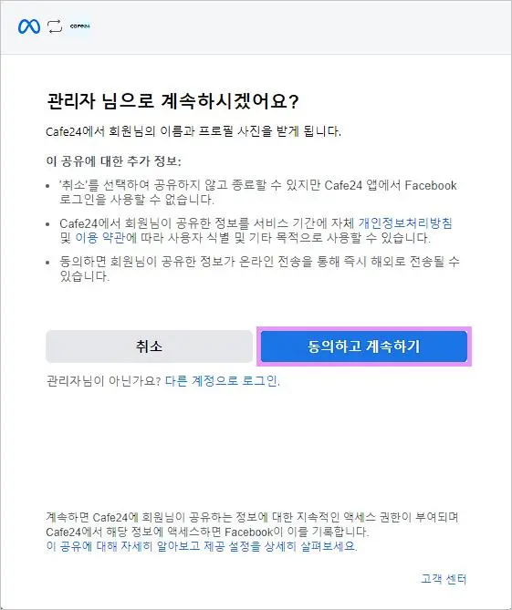 페이스북 계정이 맞는지 확인한 후, [“홍길동”님으로 계속]을 클릭한다.