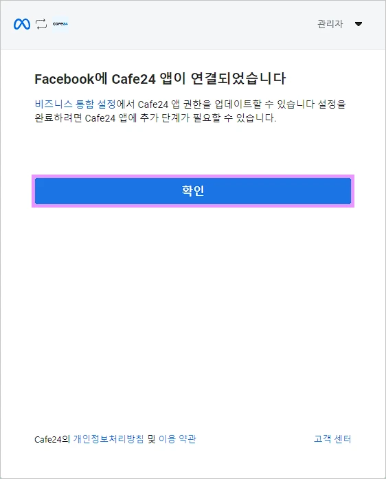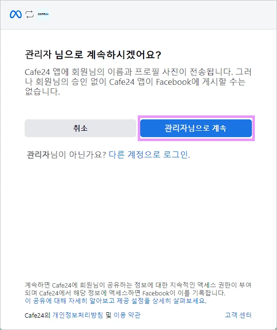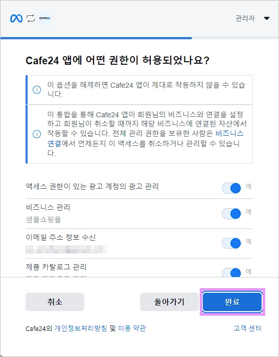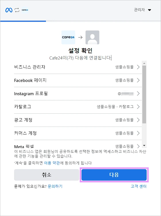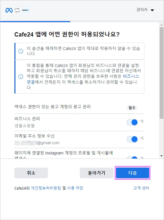 메타(페이스북)의 카페24 앱에 허용할 권한을 모두 체크한 후 [다음]을 클릭하면 메타(페이스북) 계정 연결 과정이 완료된다.