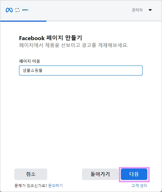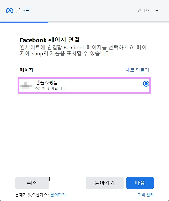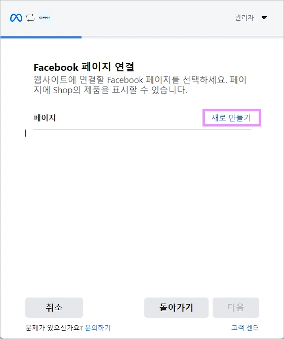 다음 단계에서는 페이스북 페이지를 선택해야 한다. 만약 페이지가 없다면, [새로 만들기]를 클릭하여 간단히 페이지를 생성한다. 이름을 입력하면 페이지가 생성되어 선택할 수 있다.