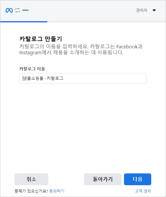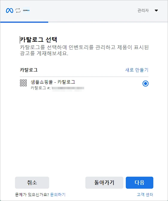 다음 단계로는 카탈로그를 만들어야 한다. 카탈로그는 해당 비즈니스의 상품 목록으로, 카페24와 연동되면 현재 연동 중인 카탈로그에 카페24의 상품 정보가 자동으로 표시된다. 카탈로그에 등록된 상품을 활용하여 광고를 집행할 수도 있다. 간단하게 만들어서 선택하면 된다.