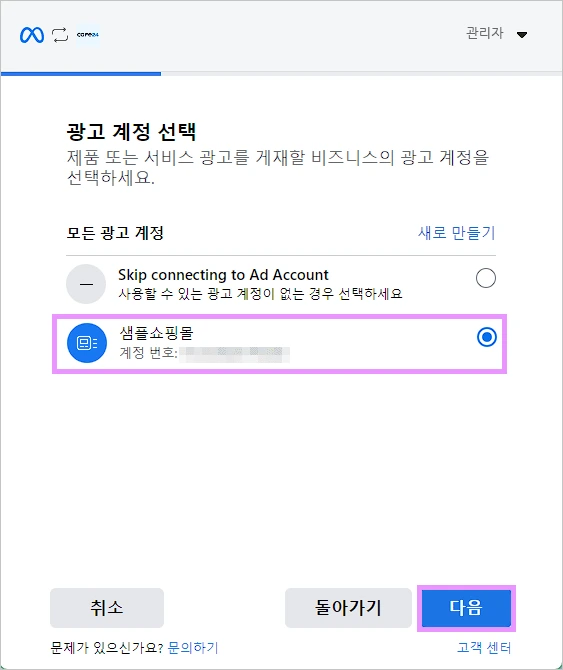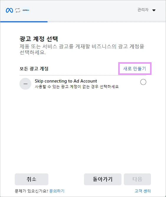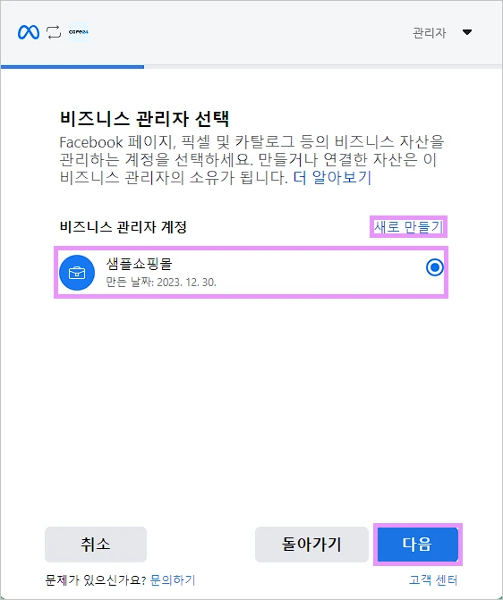 비즈니스 관리자를 선택한다. 비즈니스 관리자가 없는 경우에는 [새로 만들기] 버튼을 클릭하여 새로운 비즈니스 관리자를 간단히 생성할 수 있다.