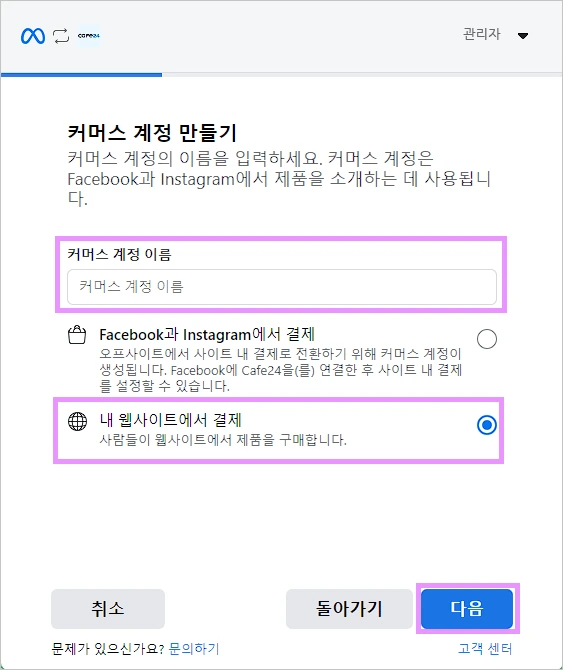 커머스 계정은 카탈로그에 연결된 상품을 페이스북 샵 및 인스타그램 샵에서 관리할 수 있는 계정이다. 이를 통해 고객에게 상품을 직접적으로 노출할 수 있다. 커머스 계정을 생성할 때는 결제 방법을 선택할 수 있는데, 카페24의 쇼핑몰에서 직접 결제가 가능하기 때문에 [내 웹사이트에서 결제]를 선택하여 진행한다.