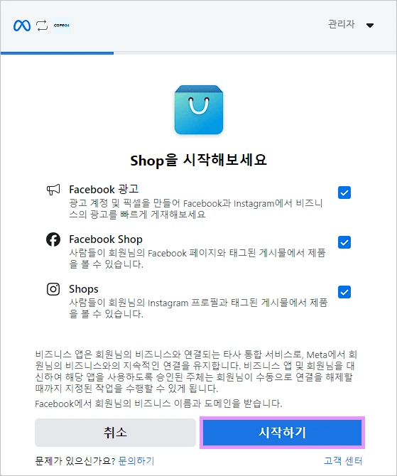 광고와 SHOP을 선택하는 화면에서 모든 필수 사항이 체크된 상태를 확인한 후, [시작하기]를 클릭한다.