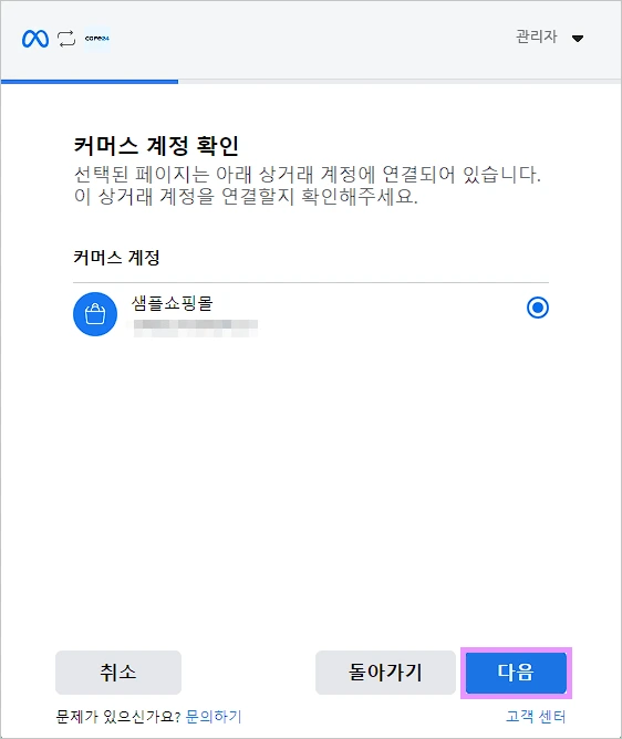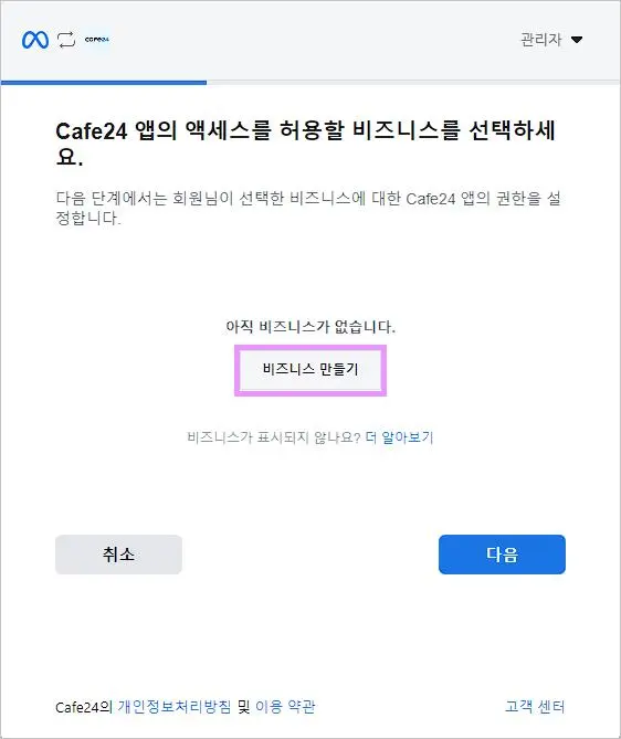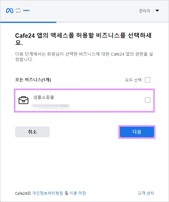 생성을 완료한 후에는 다시 카페24와 메타(페이스북) 연동 팝업으로 돌아가 생성한 비즈니스를 선택하고, [다음]을 클릭한다.