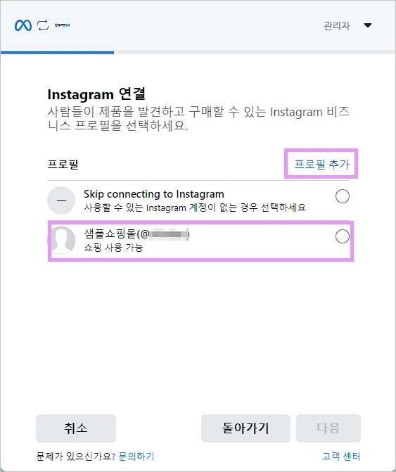 페이지를 선택한 후에는 인스타그램 프로필과의 연결을 진행한다. 미리 가입한 인스타그램 계정으로 로그인하거나, 새로운 계정을 생성하고 로그인하여 연결할 수 있는 프로필로 추가할 수 있다. 추가한 프로필을 선택한 후에 계속 진행할 수 있다. 계정이 없는 경우 건너뛸 수 있지만, 메타(페이스북) 마케팅을 진행하려면 이 단계가 필요하다.