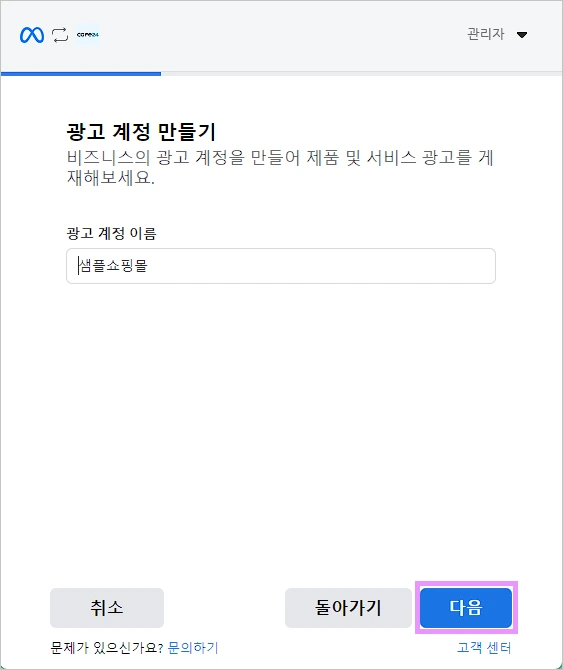 비즈니스 관리자의 메인 페이지가 새 창으로 열리면, [계정 만들기]를 클릭한다. 그 후, [계정 만들기] 팝업에서 쇼핑몰 이름을 비즈니스 및 계정 이름에 입력하고, 담당자의 이름을 이름란에 입력한다. 비즈니스 이메일 추가란에는 대표 이메일을 입력하고, 입력한 정보를 확인한 후 제출하면 된다.