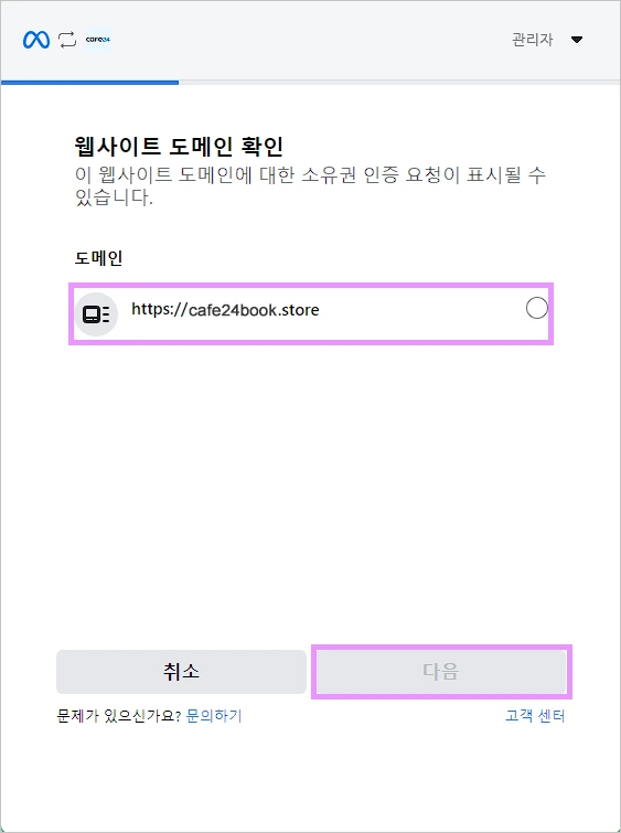 마지막으로 웹사이트의 도메인도 확인한다. 표시되고 있는 도메인이 정확한지 확인한 후에 선택한다.