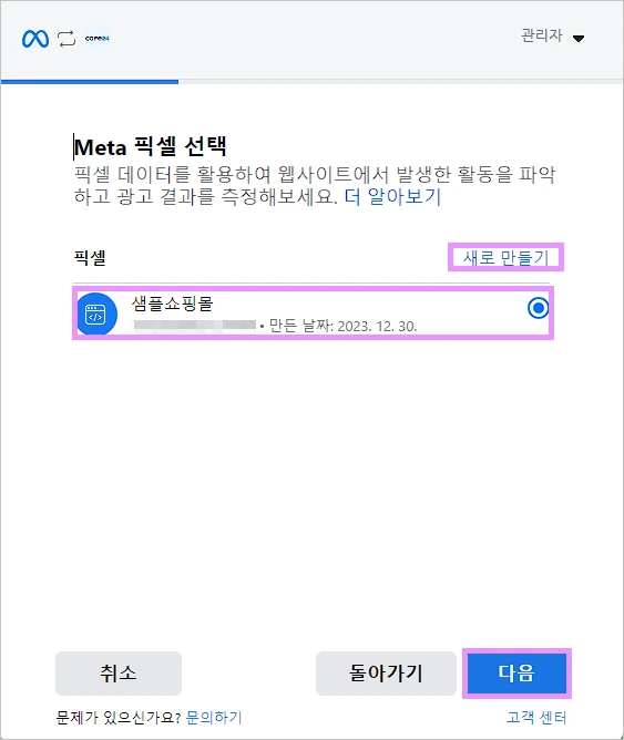 다음 단계에서는 픽셀을 선택한다. 픽셀은 광고의 데이터가 저장되는 중요한 구성 요소로, 이 데이터를 기반으로 쇼핑몰과 관련된 타겟을 설정하여 광고를 집행할 수 있다. 예를 들어 최근 3개월간 방문이 없는 고객을 타겟으로 광고를 집행하려면 해당 픽셀이 필요하다. 픽셀을 소유하고 있지 않으면 이러한 타겟 설정이 불가능하다. 따라서 픽셀은 꼭 직접 소유하고 있는 것이 좋으며, 내 경우에는 소유한 픽셀을 통해 광고를 운영할 수 있도록 광고대행사에 요청한다. 픽셀도 간단하게 만들어서 선택하면 된다.