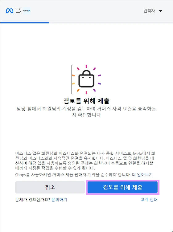 메타(페이스북) 픽셀 연결 과정이 모두 완료되었다. [검토를 위해 제출]을 클릭하고, [완료]를 클릭한다.