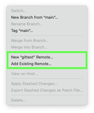 Repositories에서 디폴트 브랜치를 우클릭해서, 새로운 원격 저장소를 추가하거나, 기존의 원격 저장소와 연결할 수 있다.