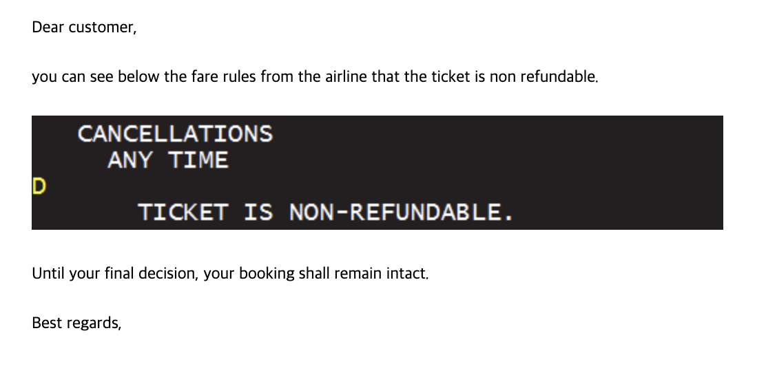 처음에는 그냥 답이 '미안 환불 안돼' 이런 식이어서 안 되는 이유에 타당한 서류를 달라고 답장을 이어갔다. 이유는 예상했지만, 이미 구매 당시 환불불가를 명시해놨다는 것이 이유였다. 그리고 서류 대신 'NON-REFUNDABLE TICKET' 부분만 캡처를 띡하고 답장이 왔다.