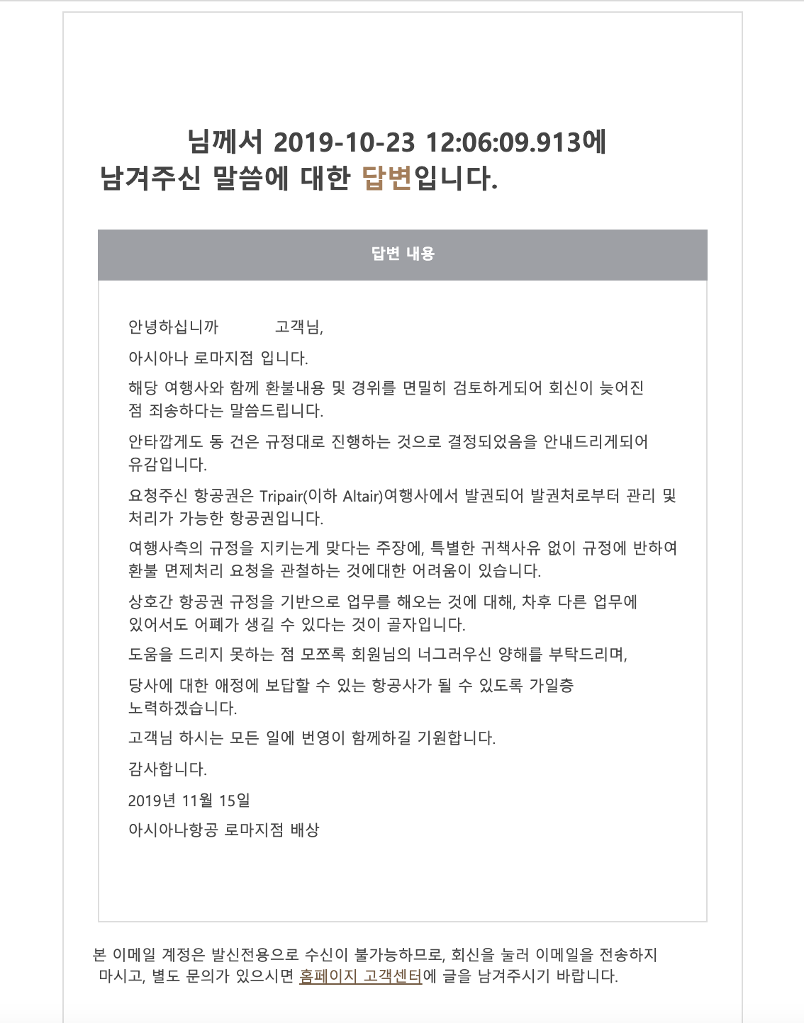 해외 여행사였기 때문에 당연하게도 국내소비자고발센터의 힘을 빌릴 수 없었고, 항공사 측에서도 여행사와 의논을 해봤지만 나 같은 여행자에 허용을 해주면 이후 비슷한 여행자들에게 다 허용을 해줘야 하기 때문에 안타깝게도 환불받을 수 없다는 소식을 듣게 되었다. 그렇게 나름 한달 간의 긴 컴플레인은 끝을 내리게 되었다.