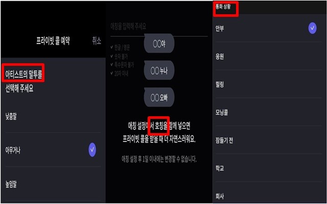 위 사진 속 서비스는 유니버스의 [AI 보이스]로, 아이돌의 목소리를 본떠 개발한 AI 음성과 원하는 시간에 전화를 할 수 있는 기능이다. AI 보이스는 낮춤말 및 높임말의 말투 설정과, 애칭 설정을 통해 아티스트가 마치 사용자의 이름을 불러주는 듯한 느낌을 받을 수 있다. 또한, 통화 상황별로 나눠 체험할 수 있다.