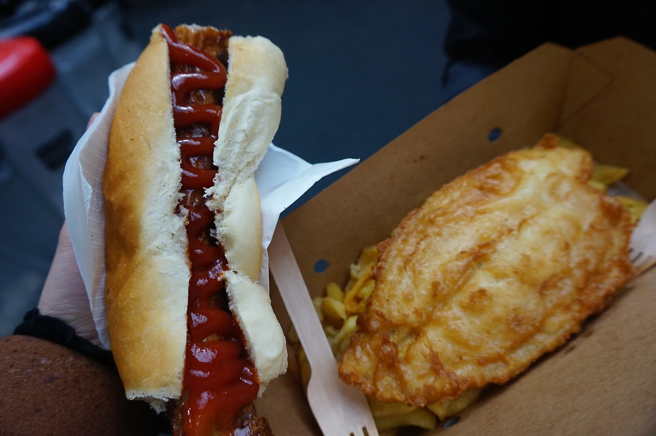 피쉬앤칩스보다 맛있는 독일식 핫도그피쉬앤칩스도 유명한 가게여서 굳이 찾아가 구매한 것인데 독일식 핫도그가 훨씬 맛있었다. 오마니도 핫도그를 한입 베어 물자마자 소세지 육즙에 따봉을 날려주었다. 영국의 버로우 마켓을 갈 때 기억하자. 'German Deli' 가게 이름을. (4년 전이라 지금까지 운영 중인지는 잘 모르겠다.)