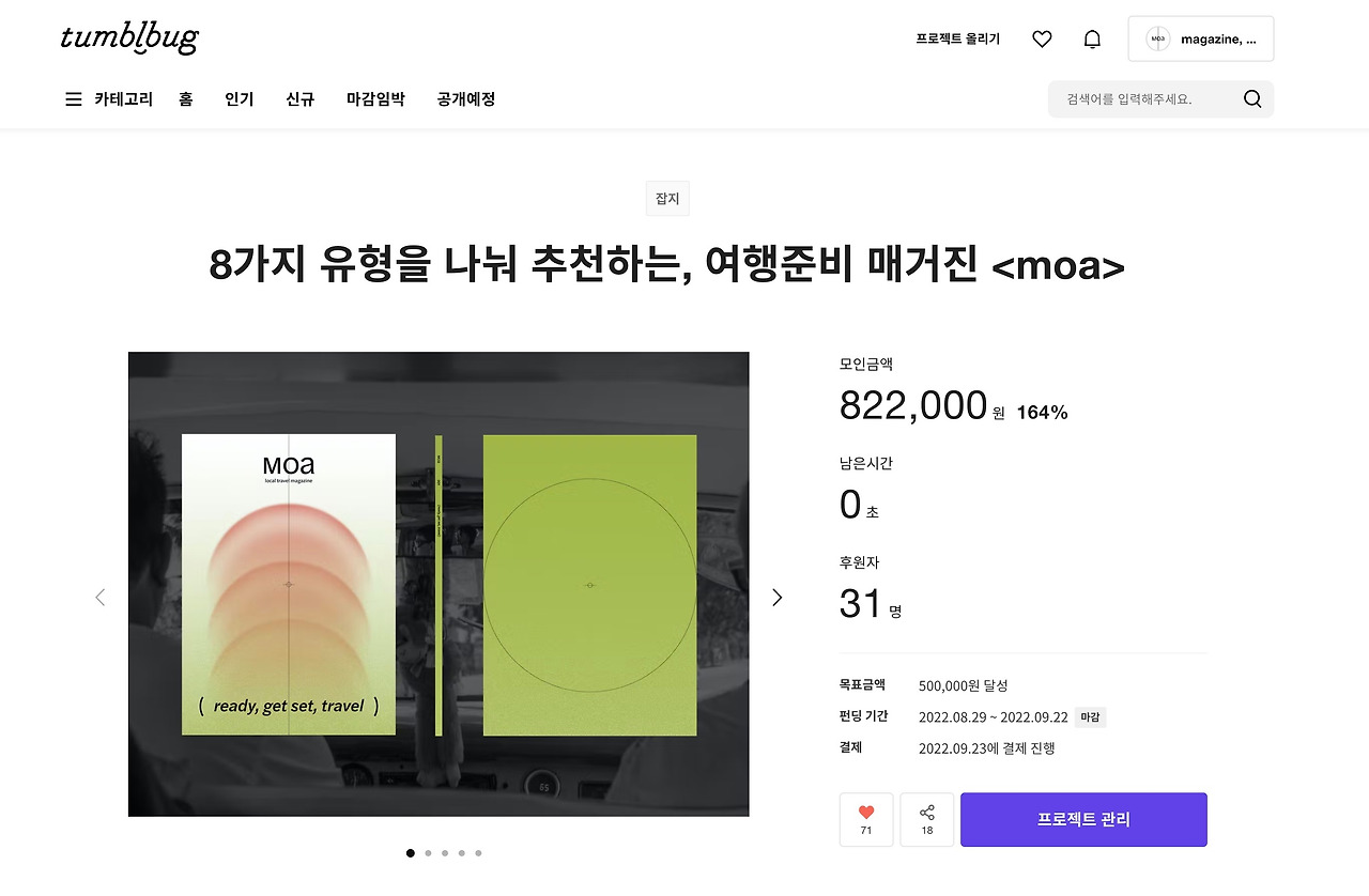 인쇄소 탐방과 매거진 교정 및 편집을 지속하며 이외 개인 업무를 하다 보니 어느덧 24일이라는 시간이 훌쩍 지나갔다. 텀블벅 후원 목표금액은 50만 원이었지만, 최소 30명 이상의 구매자가 있어야 매거진 인쇄에 적자가 생기지 않아서 마지막까지 심장이 쫄깃하였다.