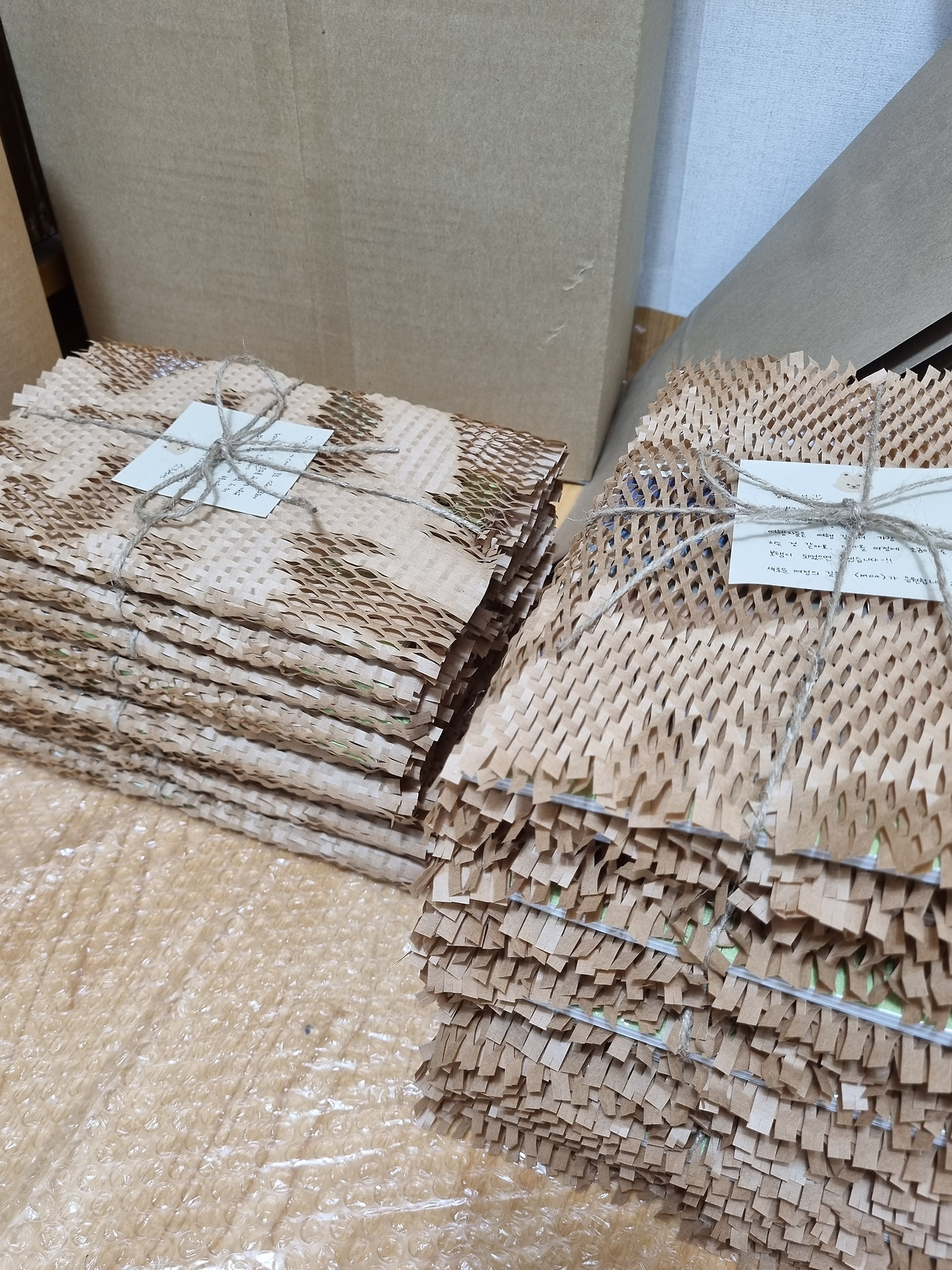인쇄물을 받았으면 이제는 포장의 시작이다. 포장은 최대한 친환경을 생각하여 비닐과 테이프를 자제하려고 노력하였다. 돈을 더 투자하여 에어캡 대신 종이 완충제를 활용하고, 비닐 택배 포장지 대신 종이 택배 상자를 사용하였다. 그리고 비닐테이프 대신 크라프트 테이프를 활용하였다. 내 나름 노력은 했다만 아예 비닐 포장지와 투명 테이프를 안 쓰기는 힘들어 이 정도로 포장재 준비를 마무리하였다.