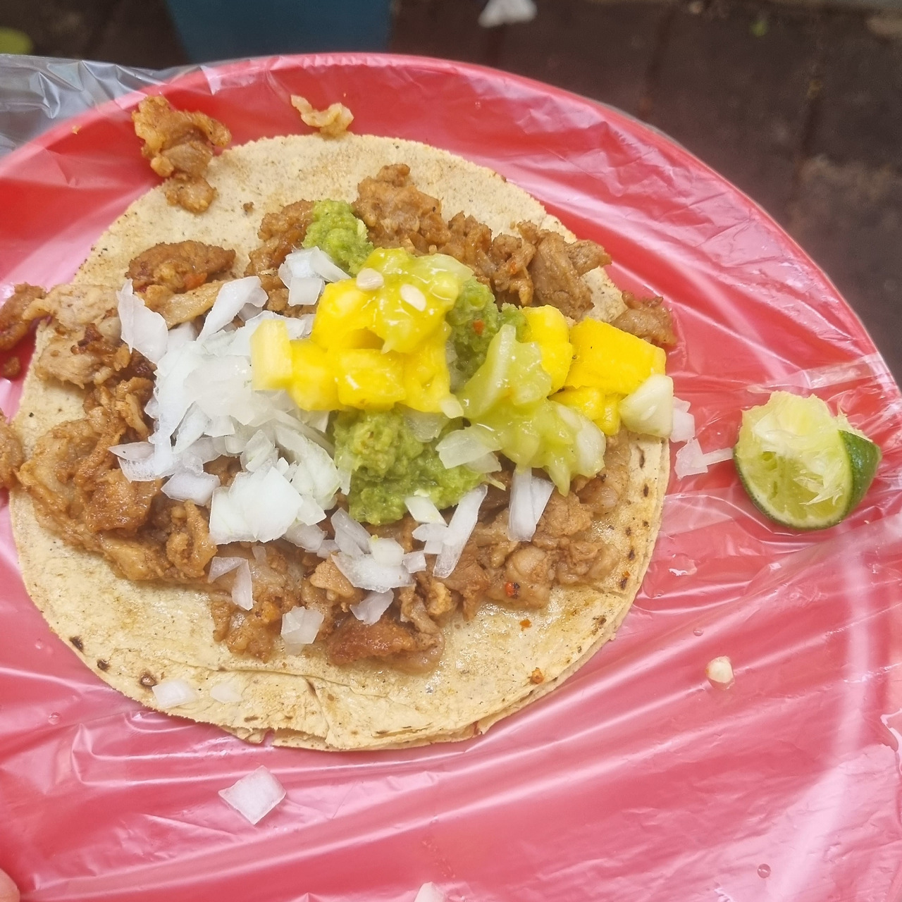 소스와 야채 셀프바우리나라에서 '멕시코 타코'로 불리는 '미국식 타코'와 달리, 건네주는 타코에는 메인 재료(고기 혹은 해산물) + 고수 + 타코집마다의 시그니처 메인 야채 or 소스만 있다. 그리고 소스 & 라임 & 이외 부수적인 야채는 먹는 사람이 선택한다. 소스는 노상이던 매장이던 늘 2개 이상이 놓이는 것 같다. 나는 욕심쟁이이기에 모든 소스를 다 섞어준 후 좋아하는 양파만 별도로 올렸다.