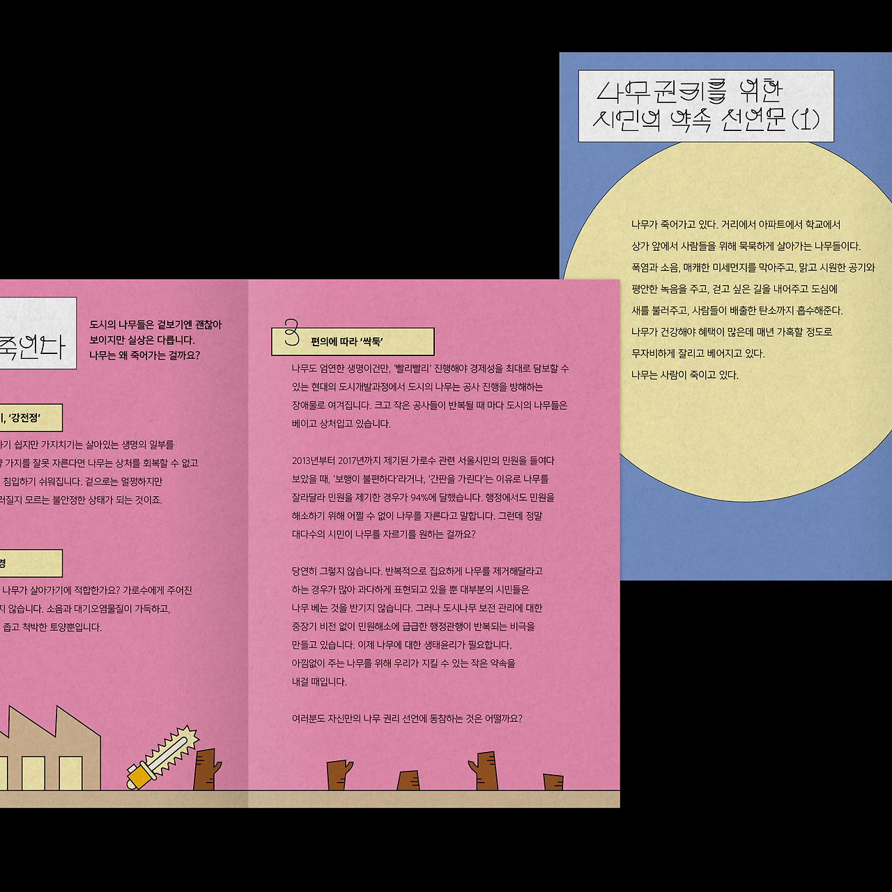 외주 작업을 시작하면서 서울환경연합, 새활용센터, 청년여성농업자, 코다 등 사람과 지구를 위한 단체들의 활동과 의미있는 프로모션에 함께하며 좋은 디자인은, 좋은 기획과 메시지에서 나온다는 것을 매번 깨닫고 있습니다.더 나은 지구와 사회를 위해 내는 목소리가 디자인으로 더 힘 업어지길 바랍니다.