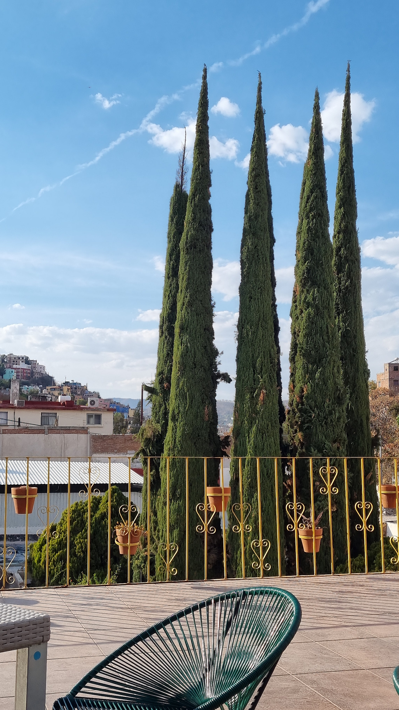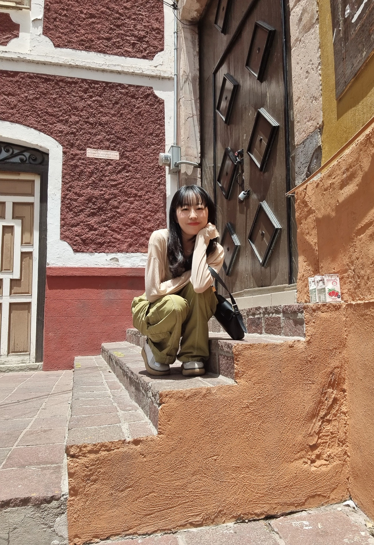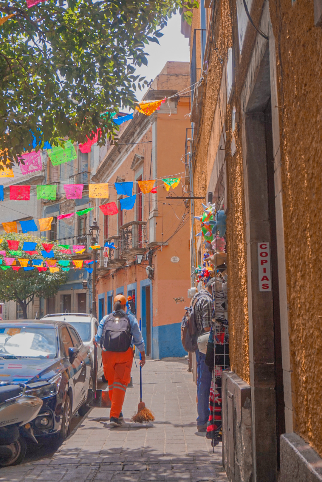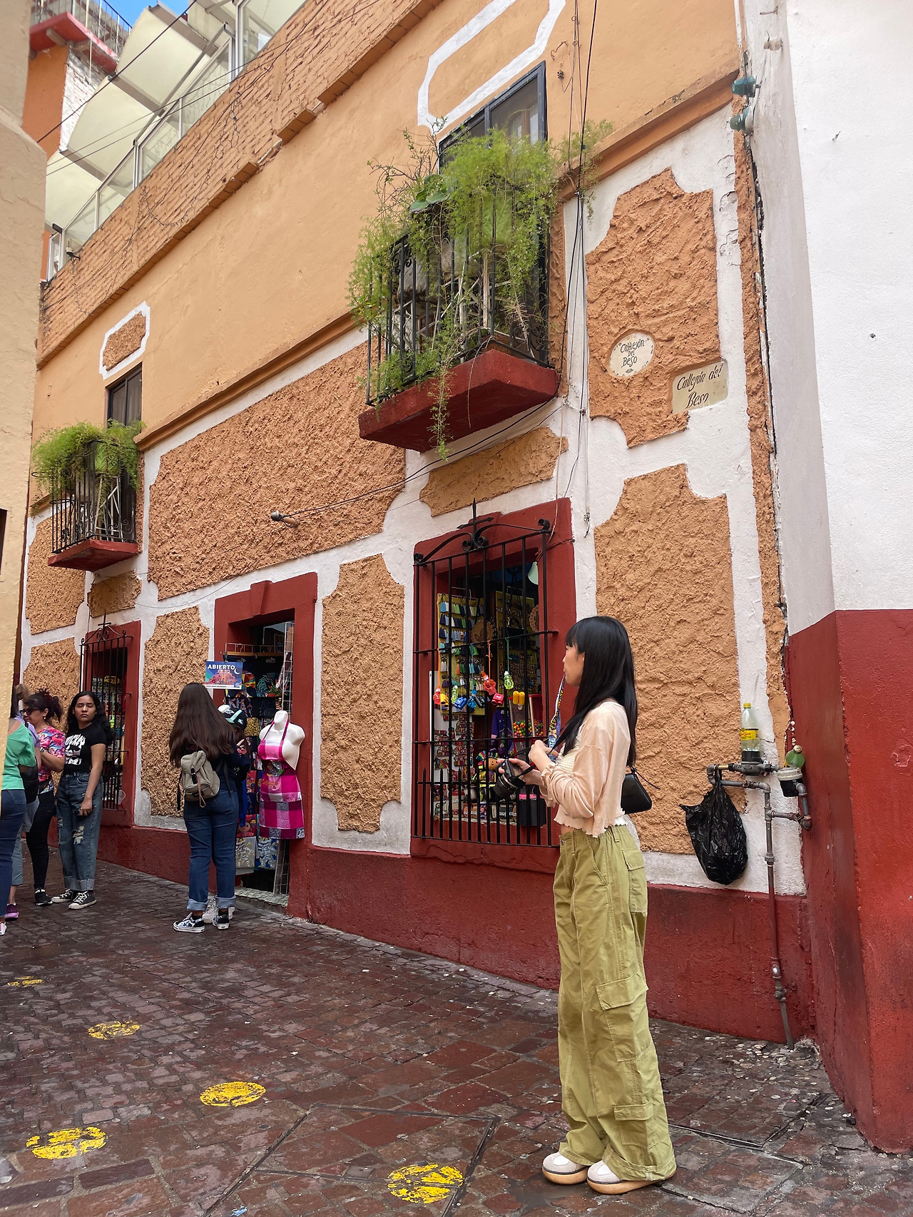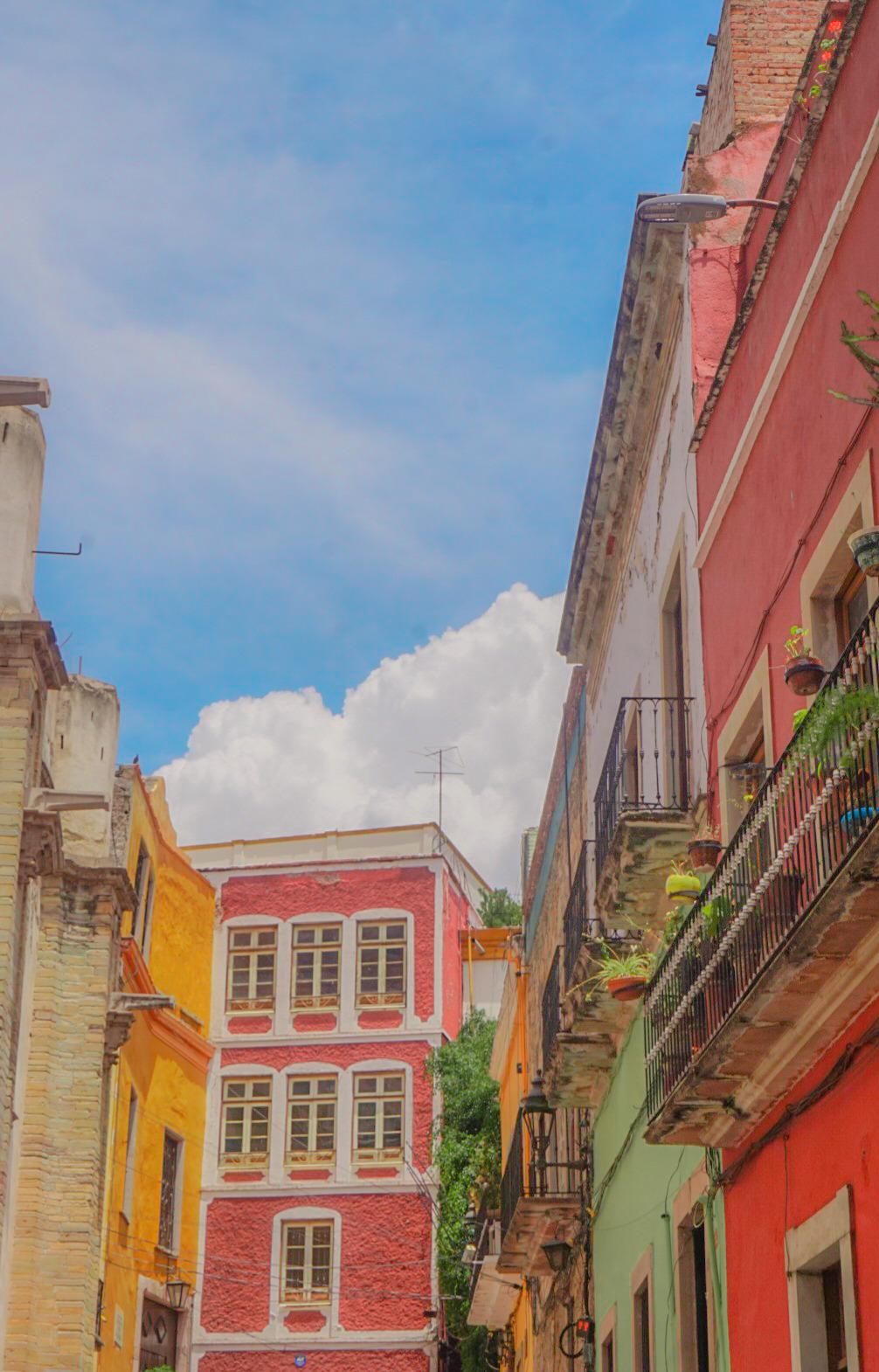 핸드폰 대신 고개를 들어 과나후아토와의 첫인상을 트였다. 온갖 형형색색의 건물에 멕시코의 봄을 알리는 보라색 나무와 작은 골목으로 들어가면 그 사이로 이어진 장식 천들. 영화 코코의 배경지답게 화려하고 쨍한 멕시코가 그대로 담겨 있었다. 이곳에 오기 전 설렌다고 영화 코코까지 보고 온 사람.. 나야 나