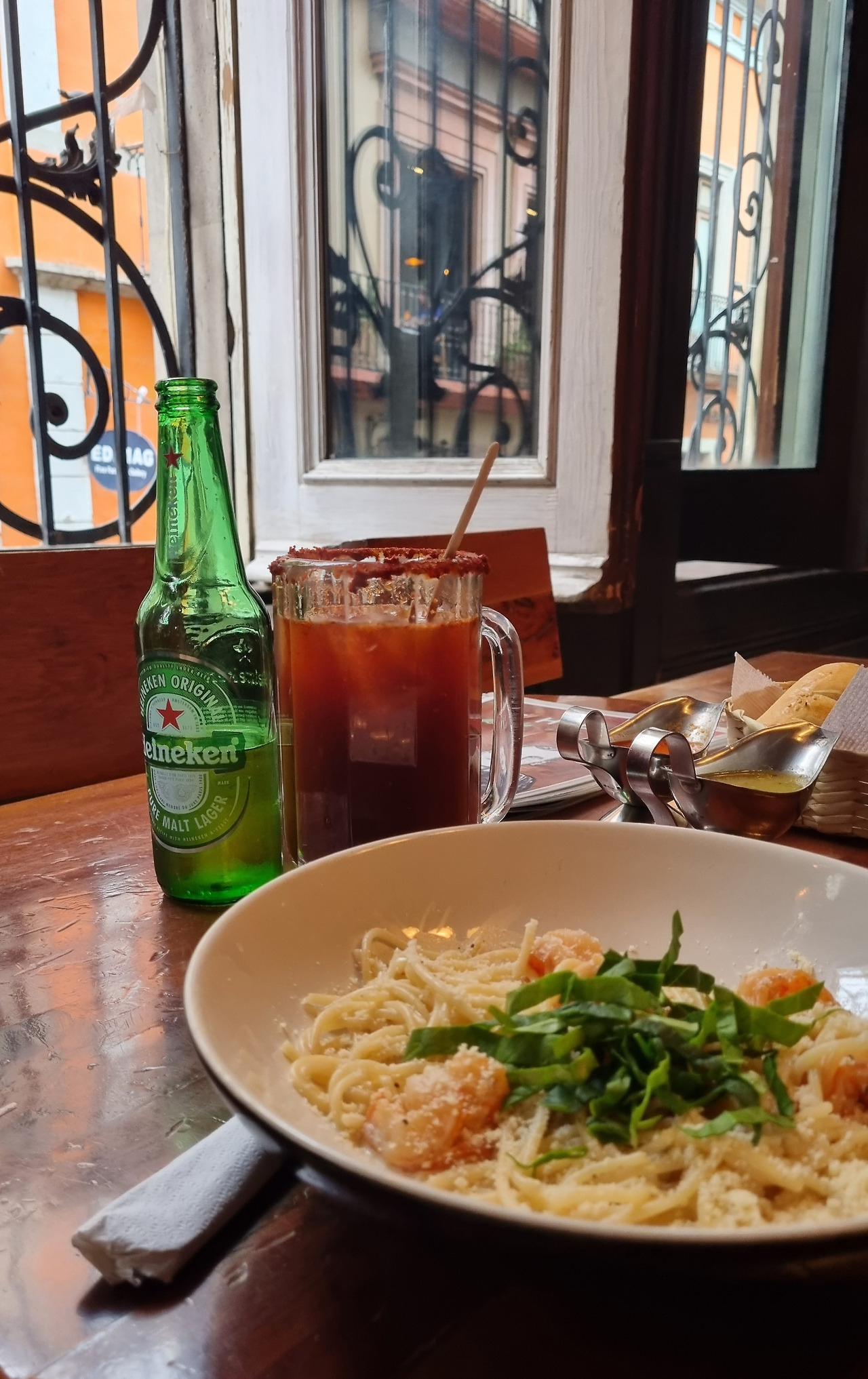 말했잖아여 나 날씨요정이라고잇!!!!멕시코에서 처음으로 파스타를 먹어보았다. 멕시코 음식을 계속 먹었으니 멕시코의 파스타 맛은 어떨지 궁금하였다. 그리고 정체 모를 빨간색 맥주 음료도 시켜봤다. 뭔지 몰라서 종업원에 물어봤는데 얼떨결에 시키게 되었다.