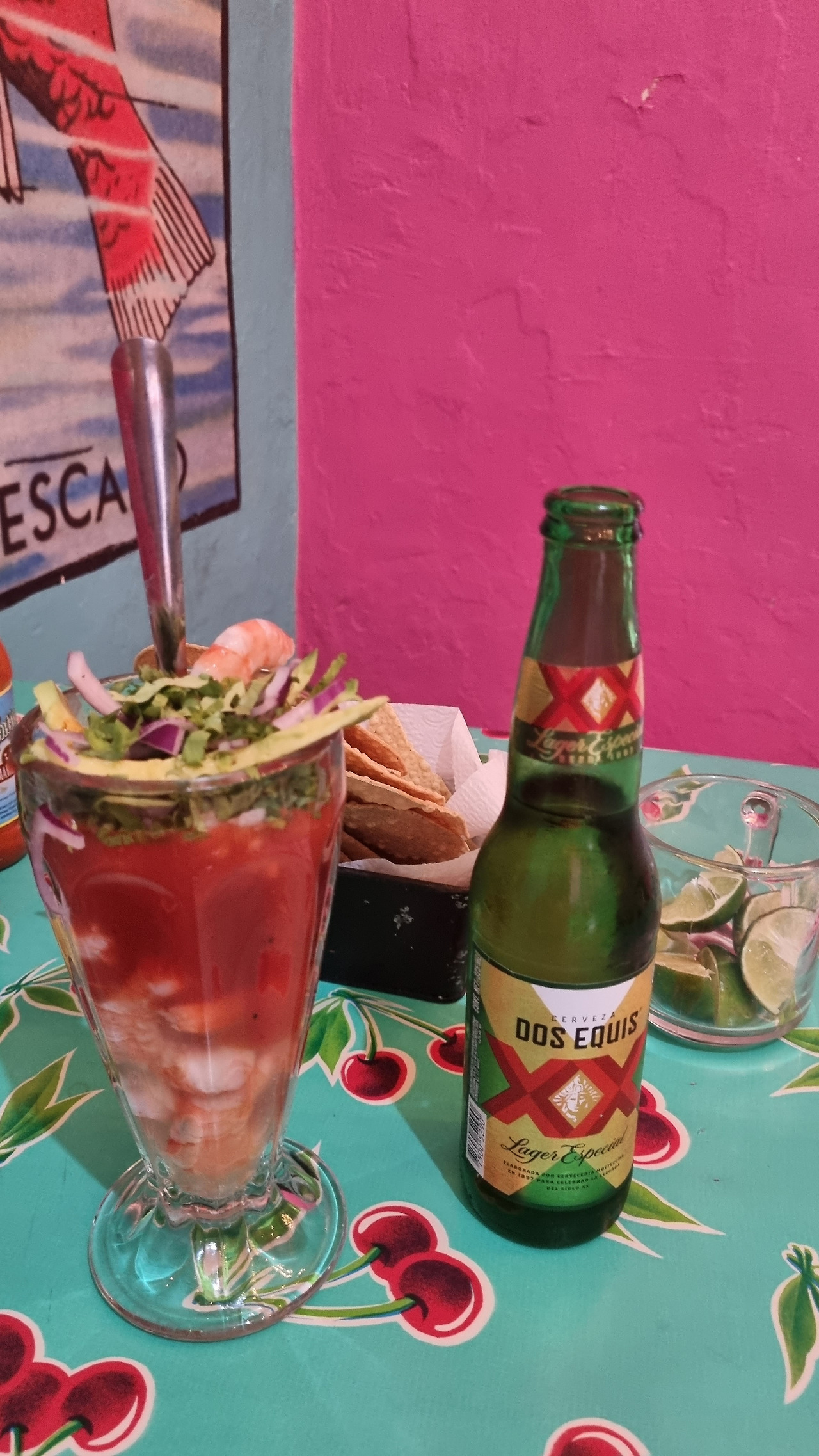 저 빨간색 맥주음료의 정체는 [미첼라다]였다. 멕시티에서 호텔을 같이 쓴 A언니가 이후에 DM으로 알려주었다. 멕시코 사람들 저 빨간 살사 소스와 가루를 진~~ 짜 좋아하는 것 같다. 똘란똥꼬에서도 사람들 손에 쥔 간식을 보면 다 크기가 엄청 크고 빨간색이었다. 과자도 음식도 심지어 음료까지 빨간색이라니.. 진정한 맵부심 민족은 멕시코가 아닐까..?
