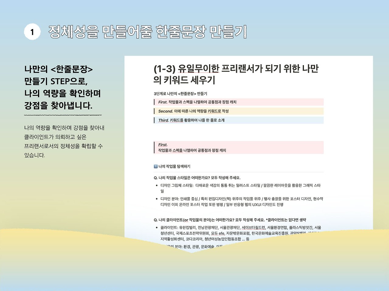 프리랜서 실무에 사용할 수 있는 계약서 및 견적서 양식들과, 프리랜서로 강점을 찾을 수 있는 <한줄문장 STEP> 노션 템플릿을 함께 제공해 드리니, 프리랜서에 도전하고 싶은 분들은 저와 함께 하여 자유인의 삶을 마음껏 누려보아요!!