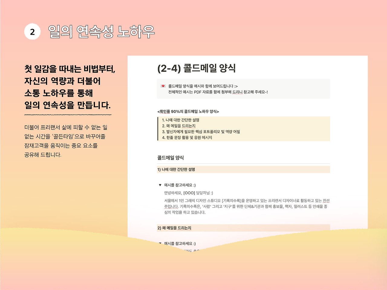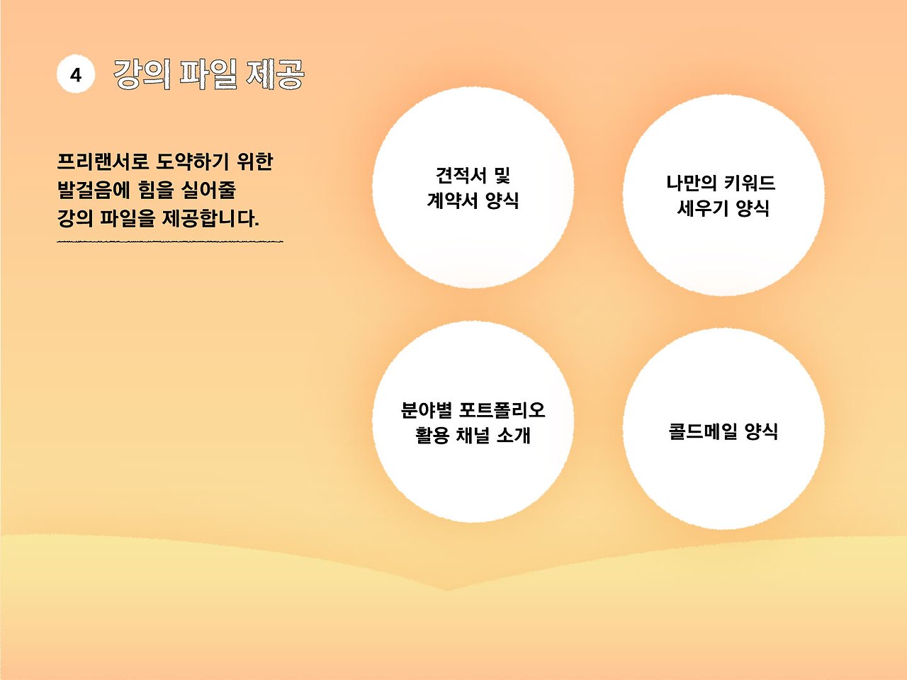 프리랜서를 지속화할 수 있는 소통 및 포트폴리오 스킬을 알아갈 수 있습니다.