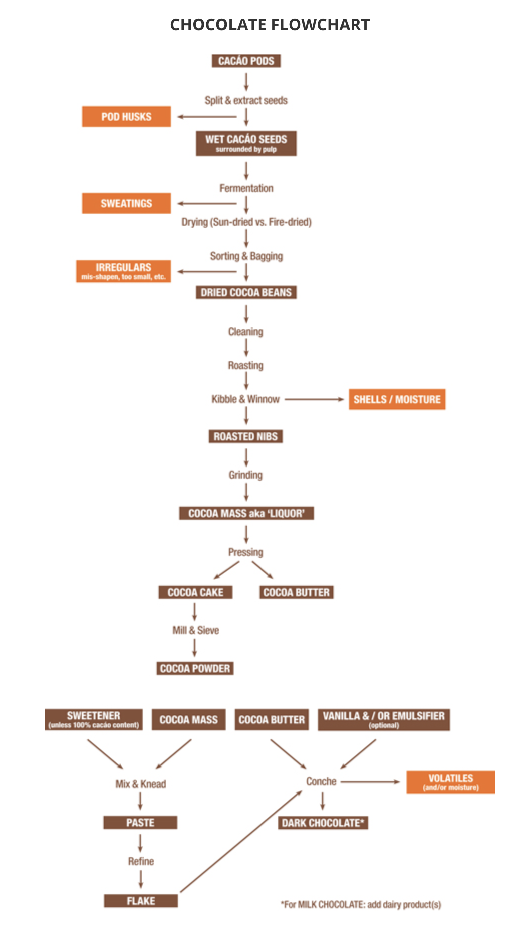 로스팅한 카카오 빈 - 그라인딩 - 카카오 매스로 변환 - 압착 - 카카오 케이크(덩어리)와 카카오 버터로 분류