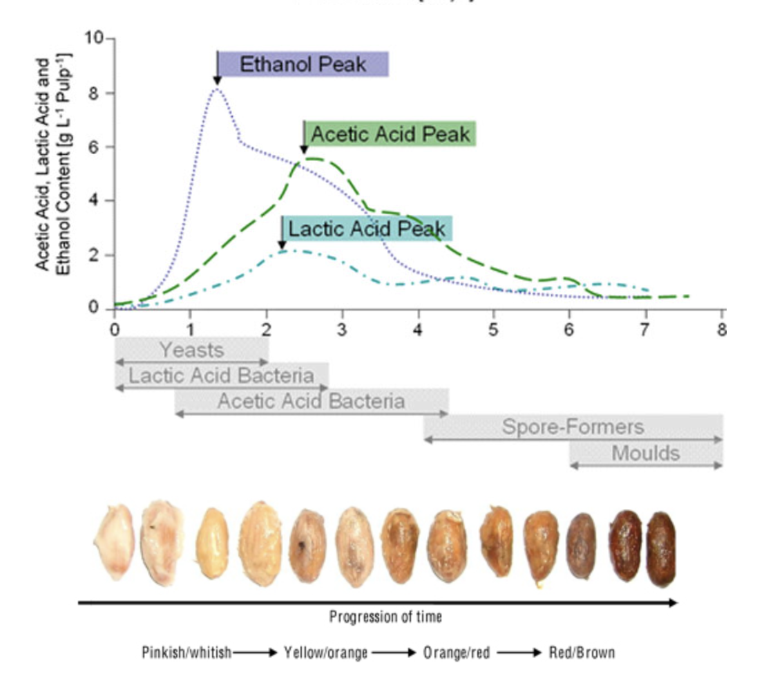 카카오 과육은 무산소 상태(anaerobic, 즉 밀봉 상태)에서 온도가 32-38'c 정도가 되면 1차 발효가 시작된다. 이 때 대부분의 당분(sucrose, 수크로스)이 과육으로부터 추출된다. 1차 발효 상태는 짧으며(1~2일) 여러 활성 미생물을 배출한다. 이 미생물들은 증식하고 효소 자가 분해(오토리스, autolysis)를 통해 수크로스를 환원당(단순 포도당과 글루코스)과 알코올로 변화시켜 이산화탄소CO2를 배출한다.