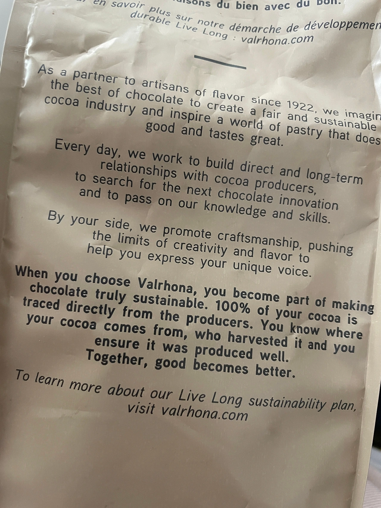 칼링고65%로 디저트를 만들 때 느꼈는데 열이 가해지면 그 시큼한 발효향이 엄청 강하게 발현된다. 더욱 다채로운 풍미를 즐길 수 있다. 과연 다크 초콜릿들 중 오묘한 풍미를 가진 녀석으로 손에 꼽을 수 있는 초콜릿이다.