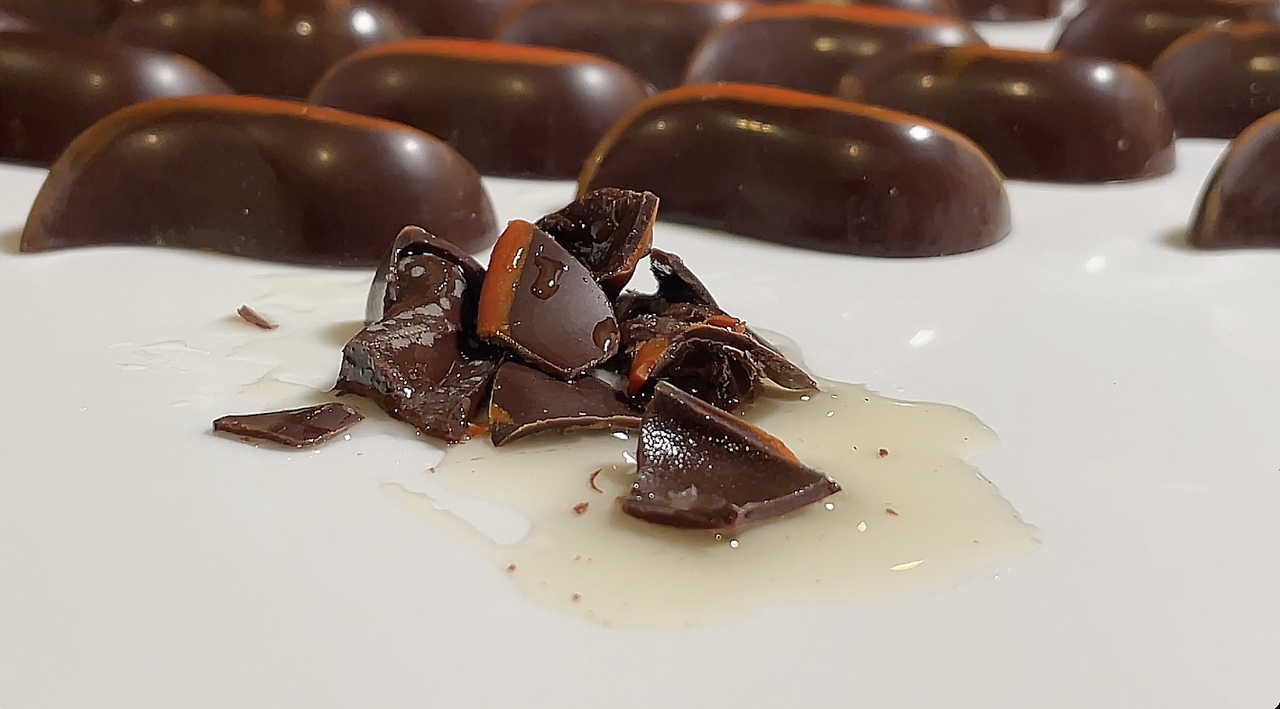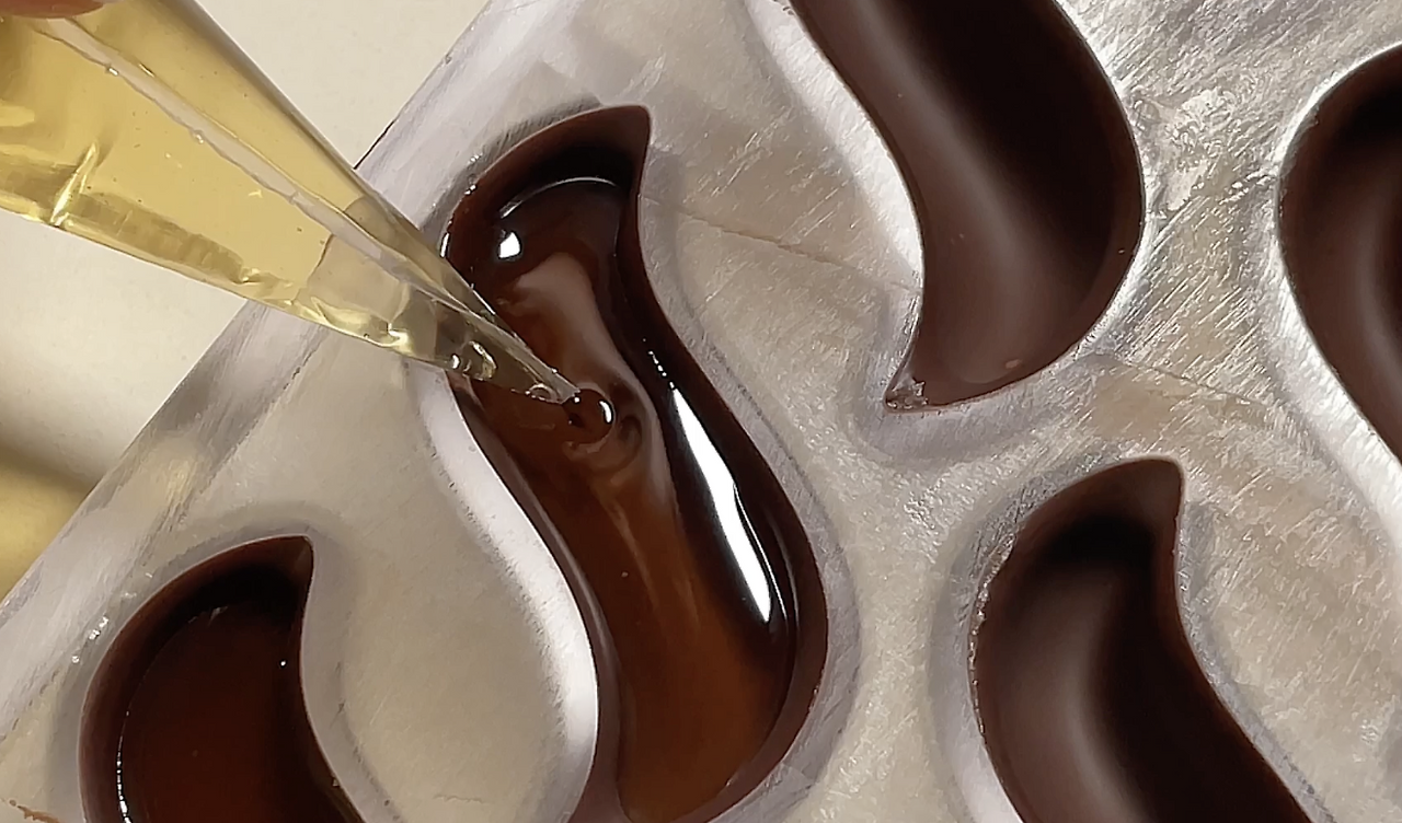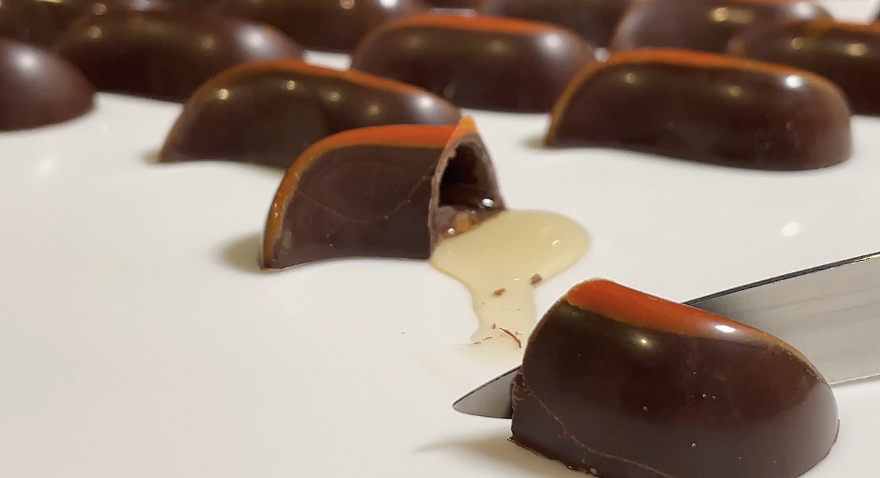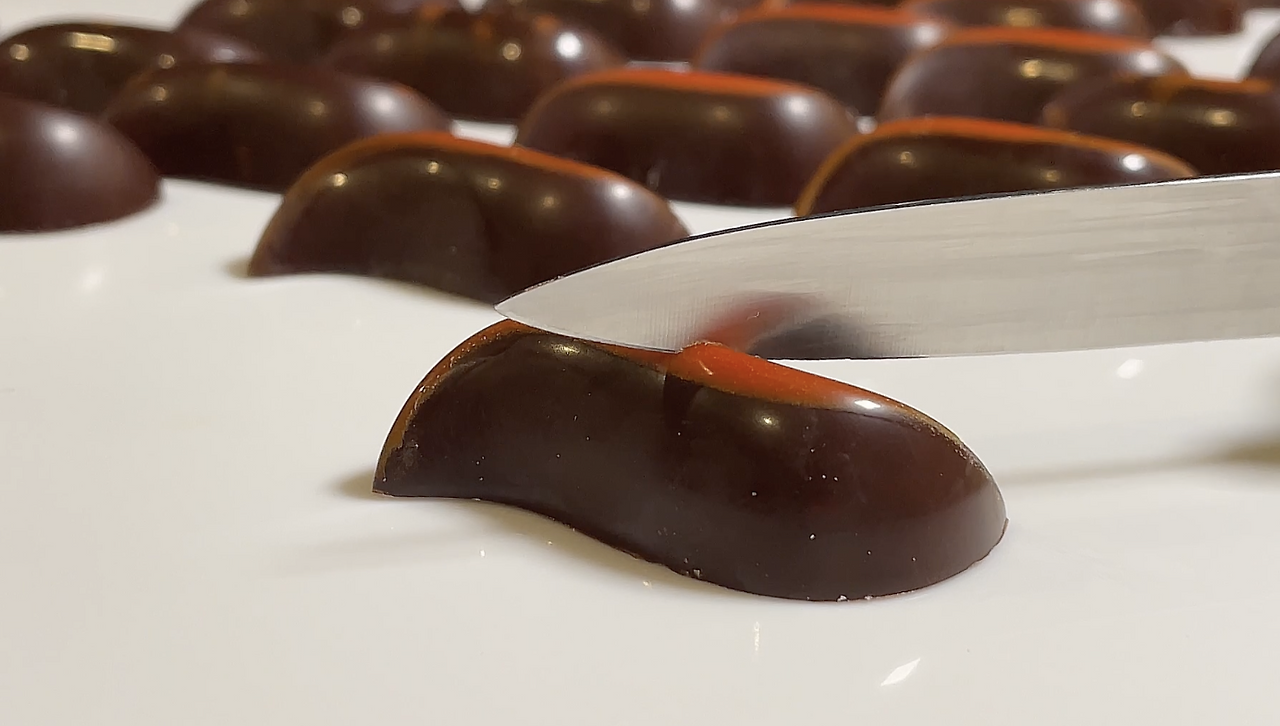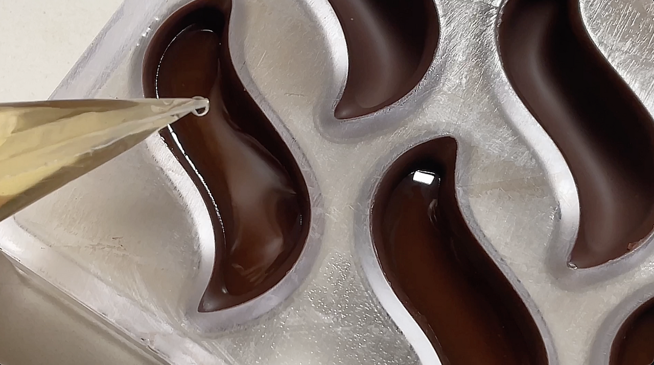 우선 평소와 같이 초콜릿을 잘 템퍼링 한 후 일반 초콜릿 쉘을 만들듯이 몰딩을 하여 쉘을 만들어둔다.