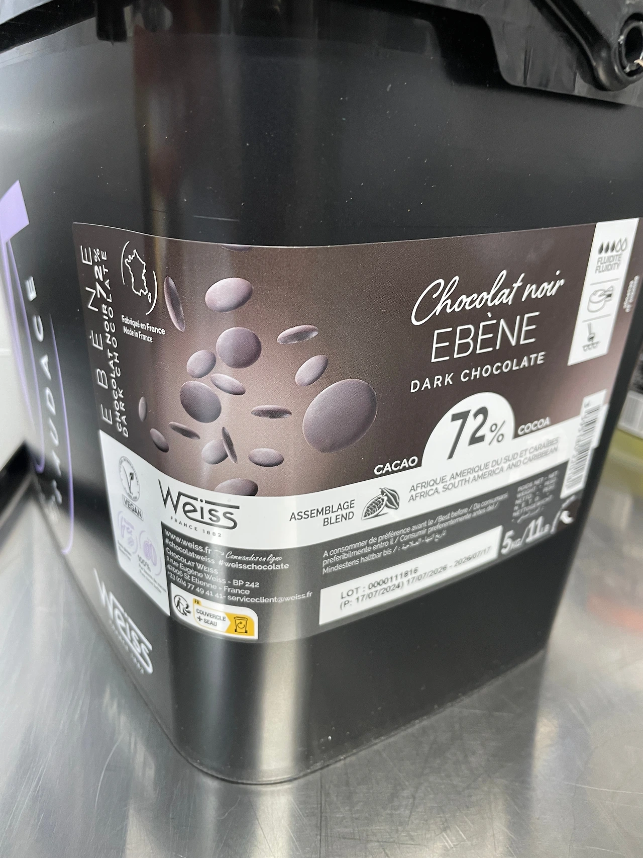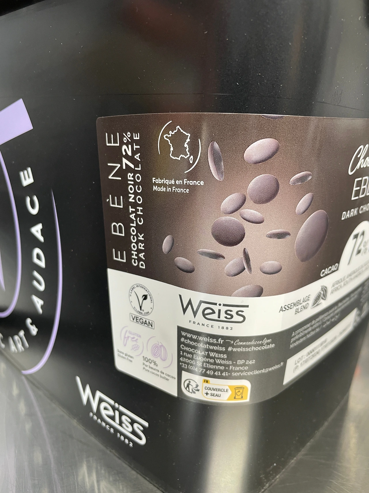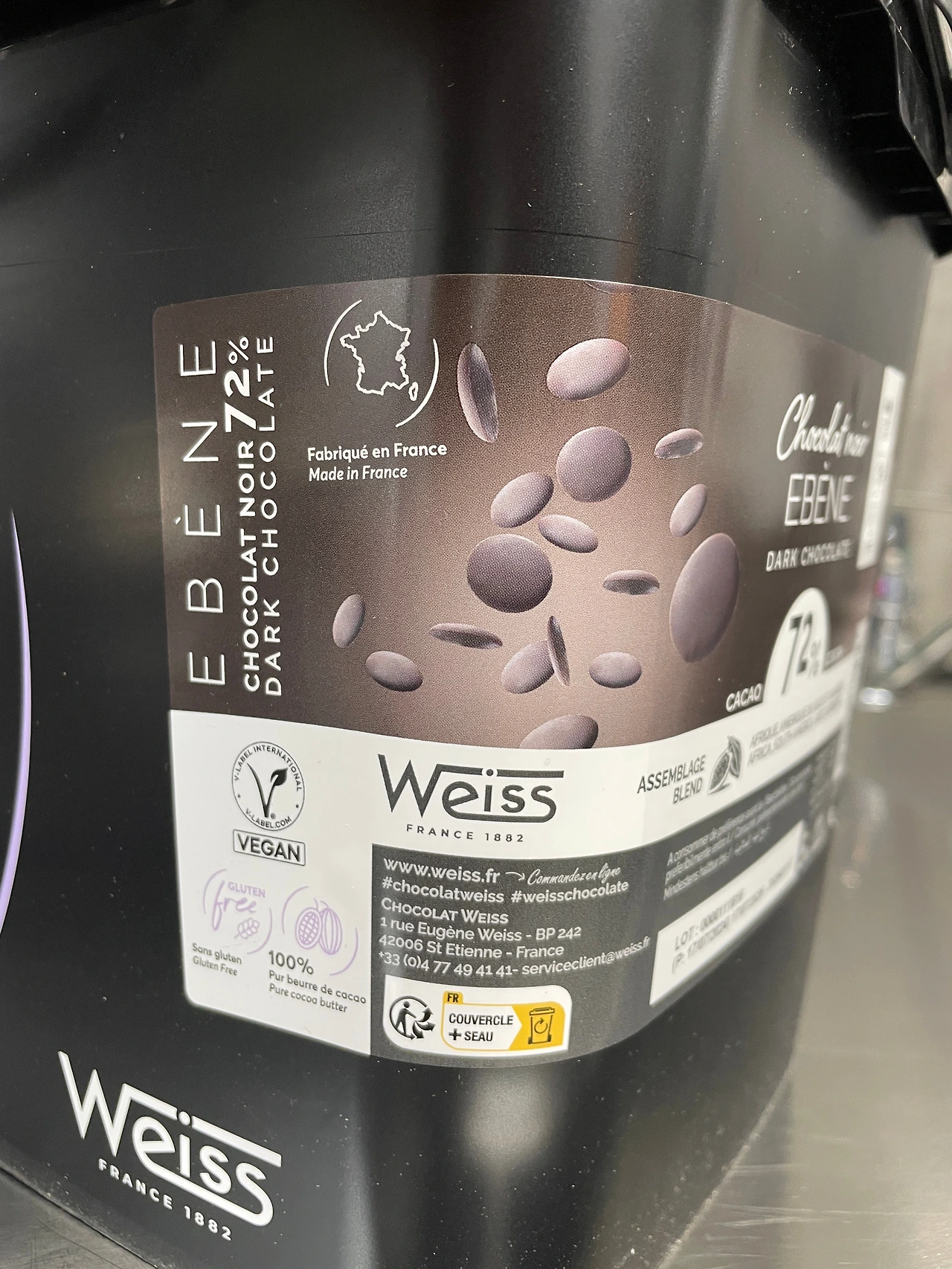 Weiss chocolate은 이렇게 bucket에 담겨 오는데 표면의 라벨을 보면 여러 인증 마크와 원재료들이 적혀있다.