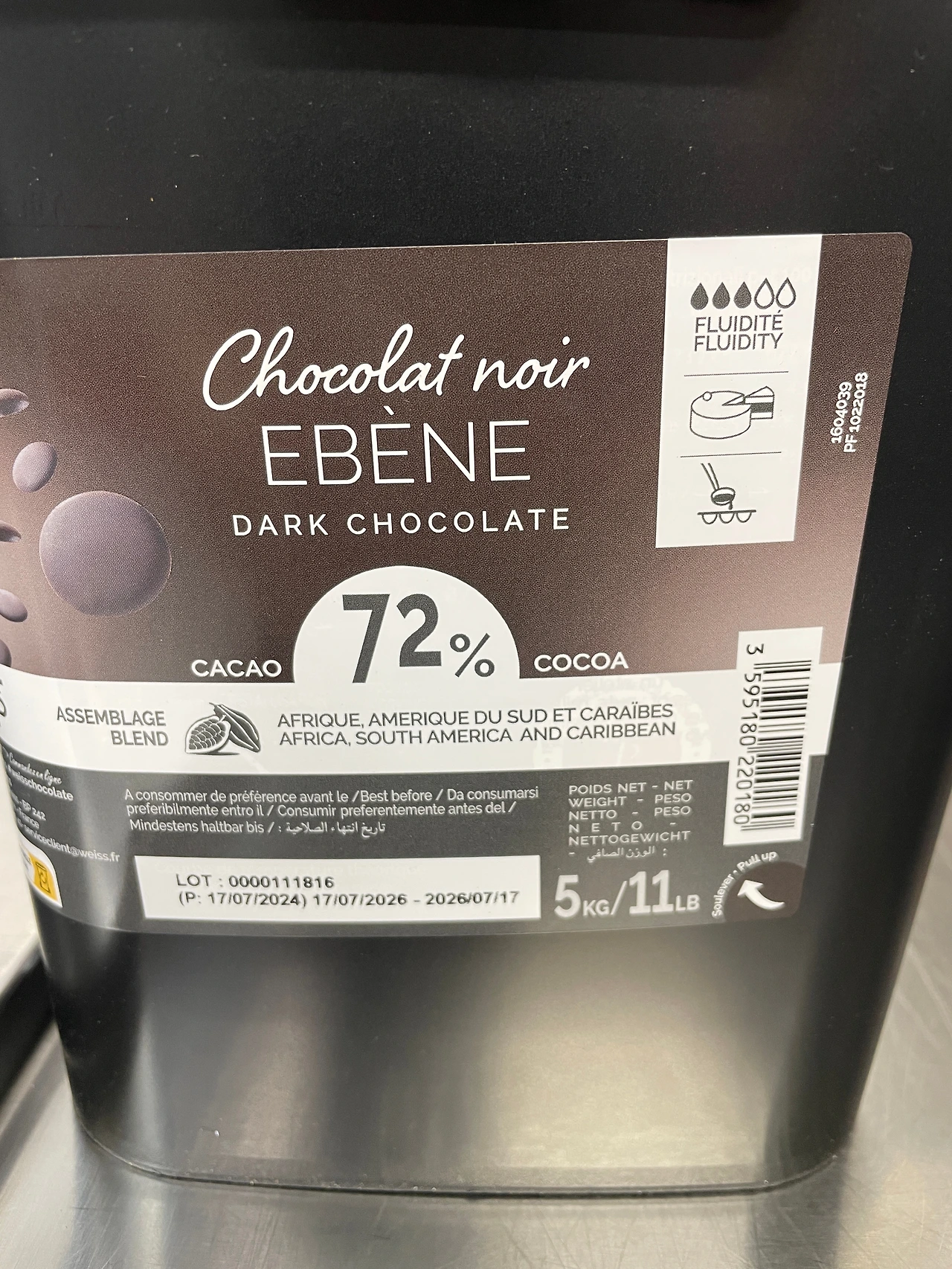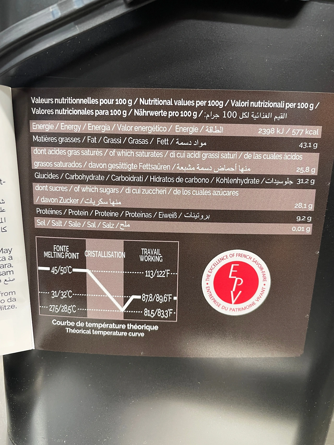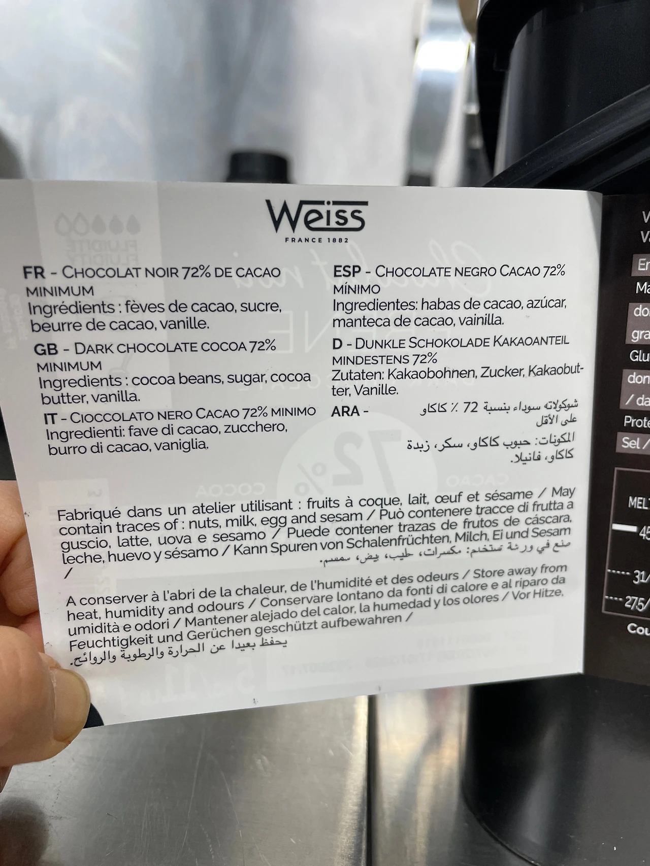 Weiss chocolate은 이렇게 bucket에 담겨 오는데 표면의 라벨을 보면 여러 인증 마크와 원재료들이 적혀있다.