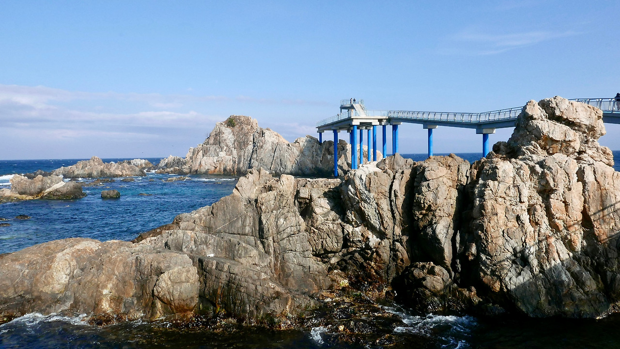 이번 여행은 내내 바다를 끼고 있었기에 ‘수산물 공략’이 주요 목적 중 하나였다. 싱싱한 수산물을 찾아 -걸어가지는 못했지만- 화진포에서 멀지 않은 거진항에서 멀지 않은 거진항수산물판매장에 가보기로 했다. 화진포에서 출발해 내비게이션이 알려주는 경로를 무시하고 길에 번듯하게 놓인 표지판을 따라가니 왕복 2차선의 해안도로가 나왔다. 그리고 그 중간에 의외의 명소 ‘백섬(백암도) 해상전망대’를 만났다.