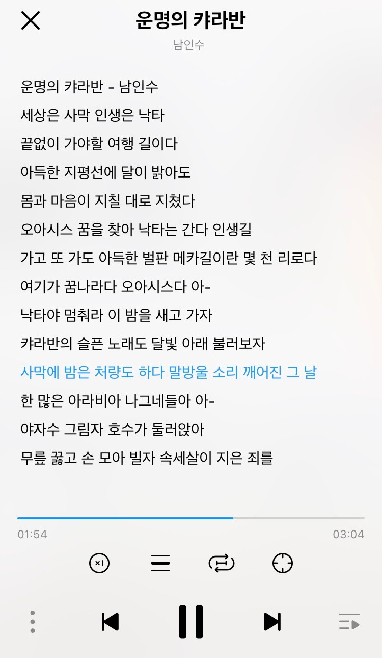 조용필에게는 ‘킬리만자로의 표범’이 있다면, 남인수에게는 ‘운명의 캬라반’이 있지 않을까. 두 곡 모두 흐릿한 땅 위에 선명한 궤적을 뒤로하는 이름 모를 이가 떠오른다. 게다가 둘 다 나레이션으로 시작하기도 하고. 거기에 두 명곡은 가사가…가사가…대단하다! “무릎 꿇고 손 모아 빌자 속세살이 지은 죄를”이라니… 이 곡을 들으면서 이 곡의 작사가, 작곡가분들은 사막을 가 보셨을까,라고 생각했다. 내심 아니기를 바랐다. 낭만은 동경과 현실 사이 괴리에서 그 내음이 더 짙어진다는, 새로 세운 얄팍한 내 낭만론을 믿고 싶어졌다.