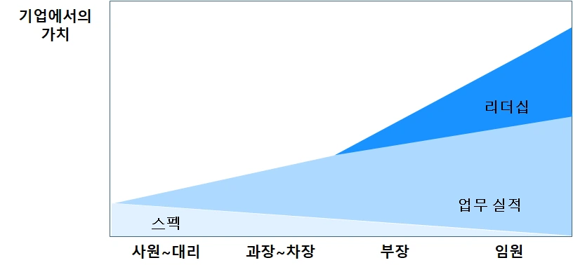 보통 학력, 영어실력, 자격증으로 대표되는 스펙은 신입직급에서 중요한 요소이겠지만 직급이 높아질수록 스펙을 따져보는 경우는 급격히 낮아진다. 대신 실제 개인이 달성한 실적의 비중이 급격히 높아진다. 이쯤되면 스펙을 물어보는 사람은 거의 없다. “걔 일 잘해? 실적이 어땠어?” 라는 질문이 그 사람을 평가하는 시기이다. 그렇게 실적을 내면서 팀장급으로 올러가게 되면 실적도 중요하지만 조직을 이끌어가는 능력인 리더십의 비중이 높아진다. 아무리 좋은 실적을 내더라도 같이 일하는 사람이 싫어하거나 사내에 평판이 좋지 않으면 롱런하기 힘들다.
