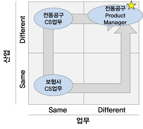 그래도 못 믿겠다면 박규동씨의 경우를 보자. 박규동씨는 기계공학과를 졸업한 공학도이다. 그러나 아쉽게도 취업난 속에 직장을 찾다보니 적성과 상관없는 보험사 CS(Customer Service, 고객 콜센터)팀에 입사를 하게 되었다. 박규동씨는 CS팀에서 고객 전화 응대, 보험 상품 상담을 하면서도 3년 정도 커리어를 쌓게 되었다. 3년이 지난 시점에 지인을 통해 스위스 건설공구업체인 힐티에서 CS팀에 경력직으로 이직을 하게 된다. 힐티 CS팀에서 고객에게 전동공구 제품 설명도 하고 주문 처리도 하면서 오랜 시간 동안 잊고 있었던 기계에 대한 관심이 살아나기 시작한다. 전동함마, 전동드릴 등을 접하면서 제품에 관심을 갖게 되었고 언젠가 적성에 맞게 기계 공구 제품을 담당하는 Product Manager가 되고 싶다는 생각을 하게 되었다. 힐티는 외국계 기업이다보니 부서 이동이 자유로웠다. 게다가 박규동씨는 CS팀 안에서도 인정을 받고 있어서 내부 평판이 좋았다. CS팀에서 2년 정도 일을 하니 전동공구라인 PM이 이직을 하게 되었다. 박규동씨는 마케팅 임원에게 전동공구 PM 자리에 관심이 있다고 어필을 했고 결국 바라던 전동공구 PM일을 하게 되었다.