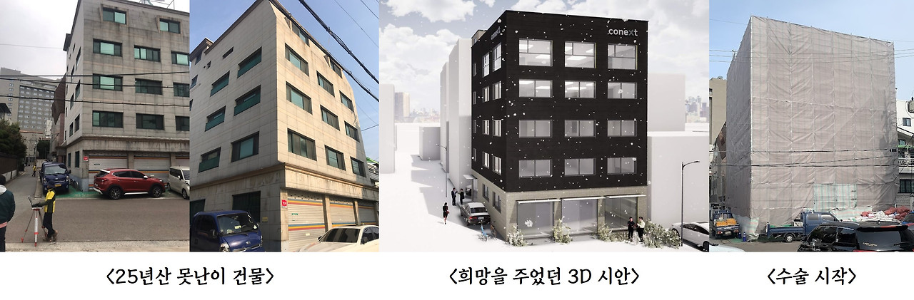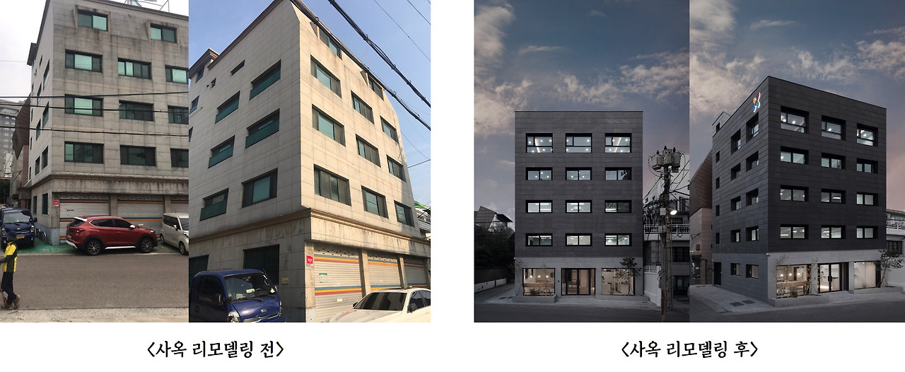 먼저 계단 라인에 배치되어 있던 화장실 자리를 허물고 엘리베이터를 시공하기로 함에 따라 외부에 있던 화장실은 사무실 내부 공간으로 이동하여, 오히려 직원들의 편의를 높였다. 외벽은 변색이나 노화를 최소화하기 위해 최고급 석재인 고흥석과 마천석을 사용하여 전체적으로 모던하고 고급스러운 분위기로 변신하는 것으로 계획하였다. 또한 그 외 많은 부분들을 디테일하게 개 보수하여, 직원들과 입주 예정자들의 사용 편의를 극대화하는 것을 최우선 목표로 설계에 돌입했다.